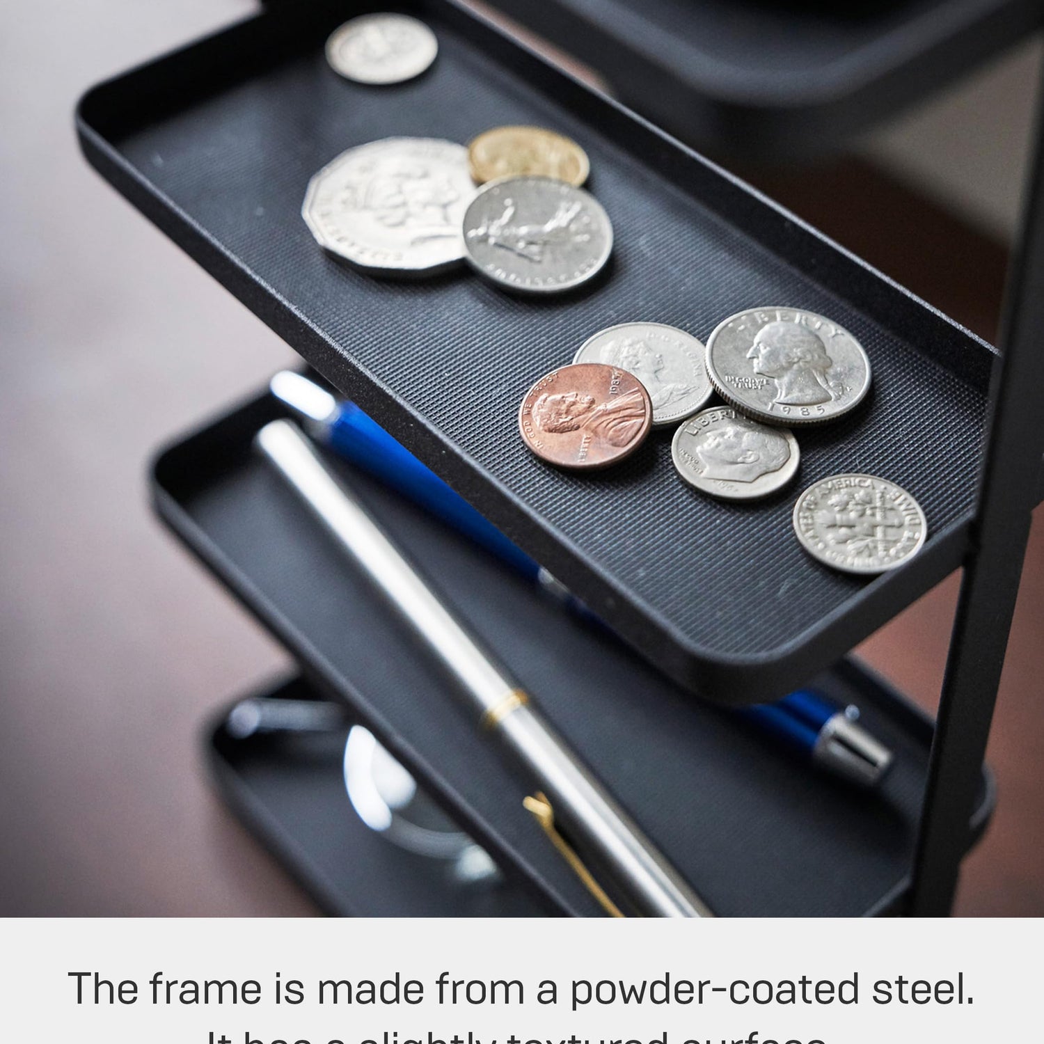 - [Made from a powder-coated steel with a slightly textured surface.] Easy to clean with a touch of a light soap and a damp cloth. Dry thoroughly.
