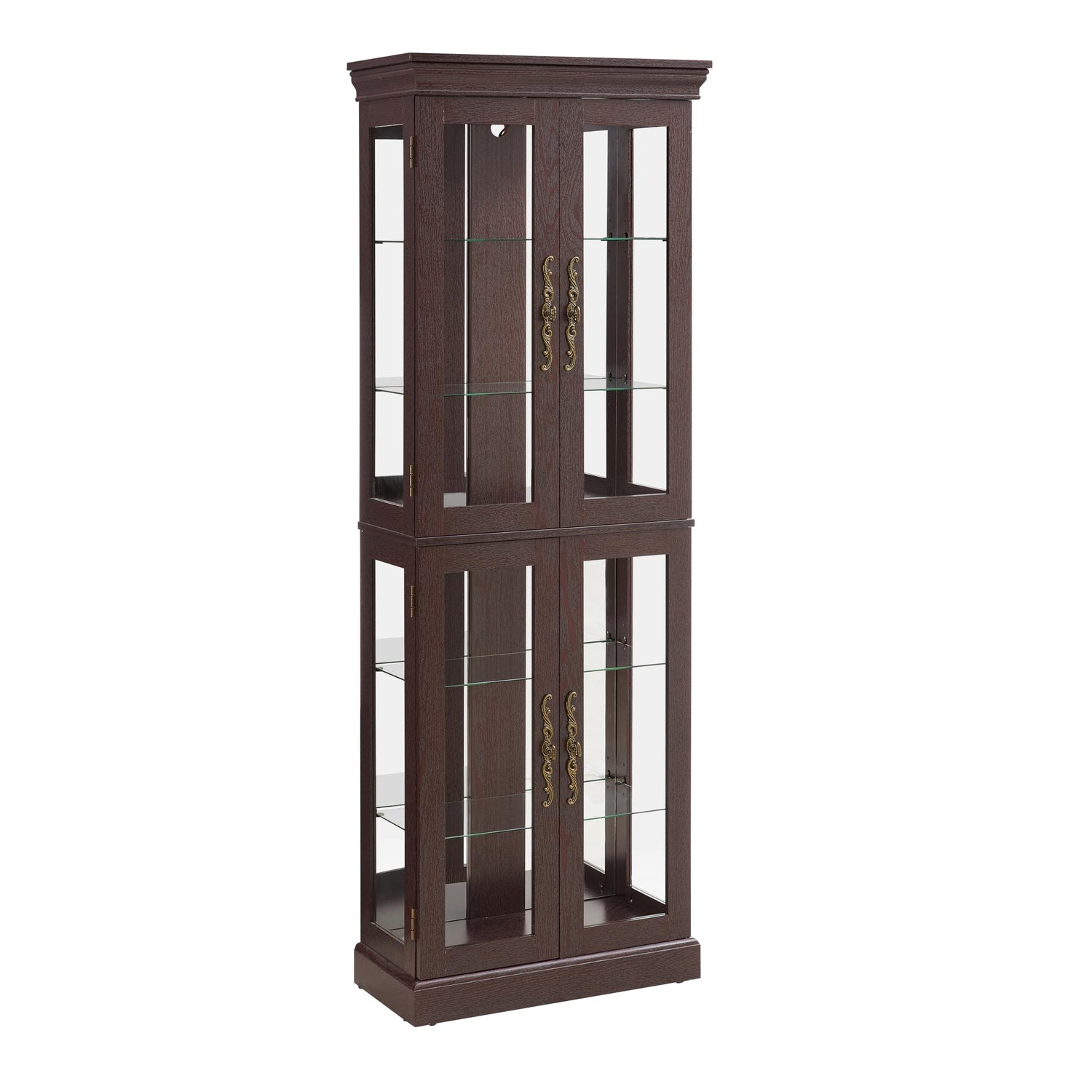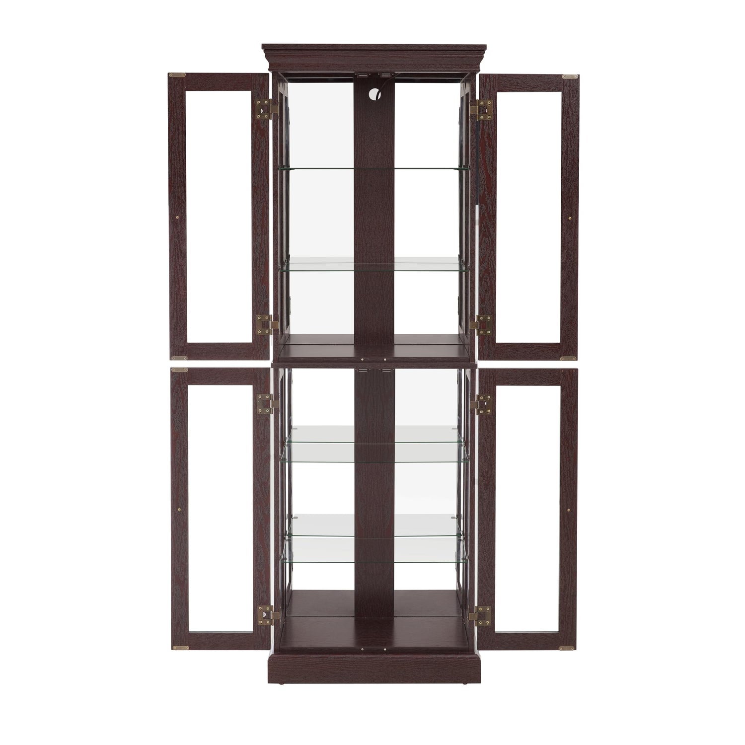 - Internal Lighting: Display your collectables within the curio display cabinet day or night by engaging the internal lighting accent system.Enjoy viewing your treasures at nighttime with the internal lighting system, and, when coupled with the mirrored back panel, there is a pleasing reflective glow to highlight the contents from any angle. The lighting system uses a standard E26 light bulb (included)