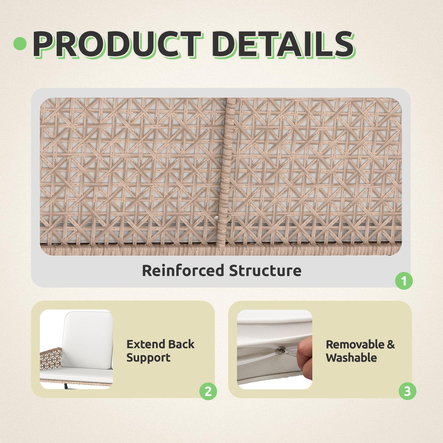• Ideal for Any Spot: Whether it's your patio, backyard, or living room, this rattan conversation set fits seamlessly into any space. It is ideal for quiet evenings inside or enjoying the outdoors with family and friends, it's as flexible as your lifestyle