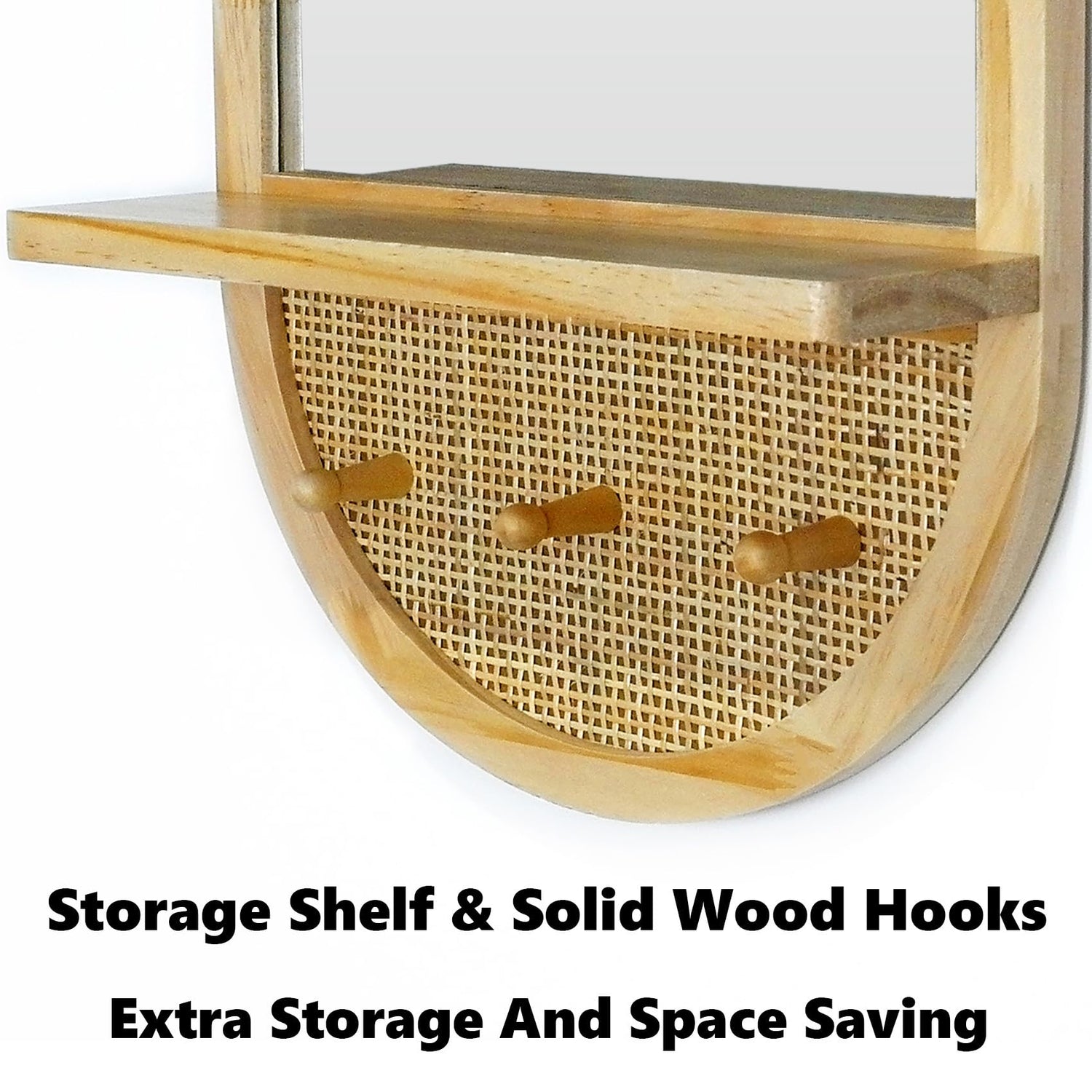 YXDXF Entryway Mirror with Hooks, 30x18 Inch Boho Wall Mirror with Removable Shelf, Oval Solid Wood Framed, Handmade Rattan Wall Mirror for Over Sink, Bathroom, Bedroom, Living Room, Hallway, Vanity