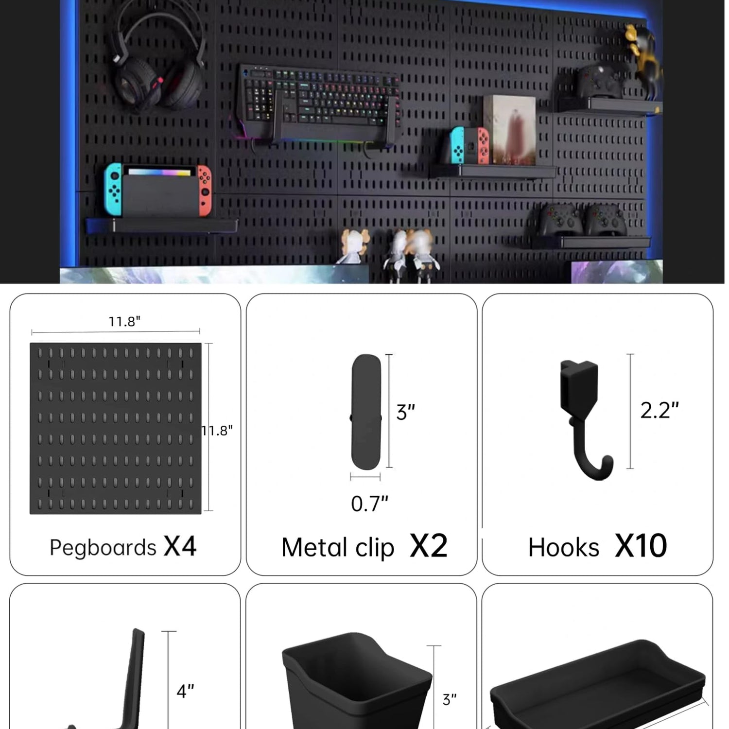 - ✅DURABLE MATERIAL AND COMPLETE ACCESSORIES: Crafted From High-Quality ABS/HIPS Material, Our Pegboard Wall Organizer Ensures Long-Lasting Durability. The Set Includes 4 Pieces Of Peg Boards (11.8" X 11.8"), 10 Small Hooks (2.2X4"), 4 Large Hooks (2.2" X 4"), 2 Long Storage Racks (7.8" X 4"), 2 Small Square Storage Racks (4" X 3.5" X 3"), And 2 Photo Clips (3" X 0.7"). Customize Your Pegboard With This Comprehensive Selection Of Accessories To Accommodate All Your Gaming Essentials.(LED Lights Not Included)