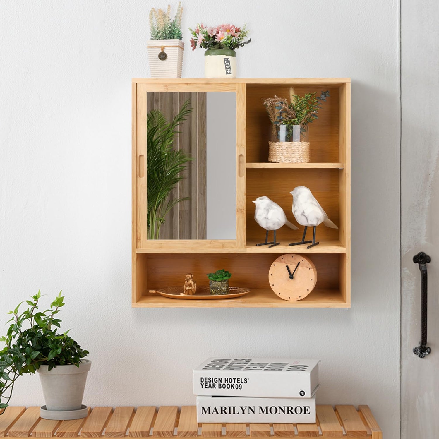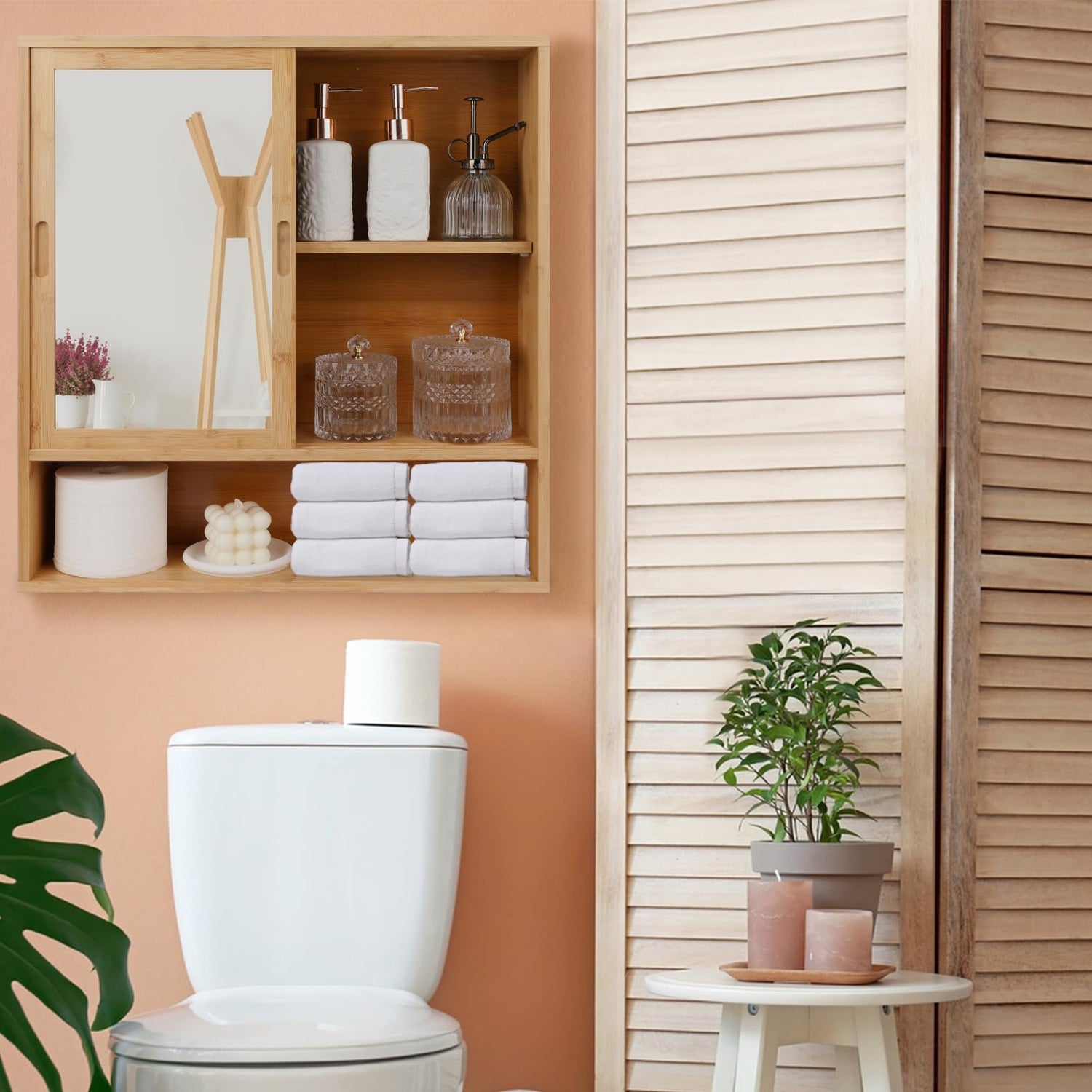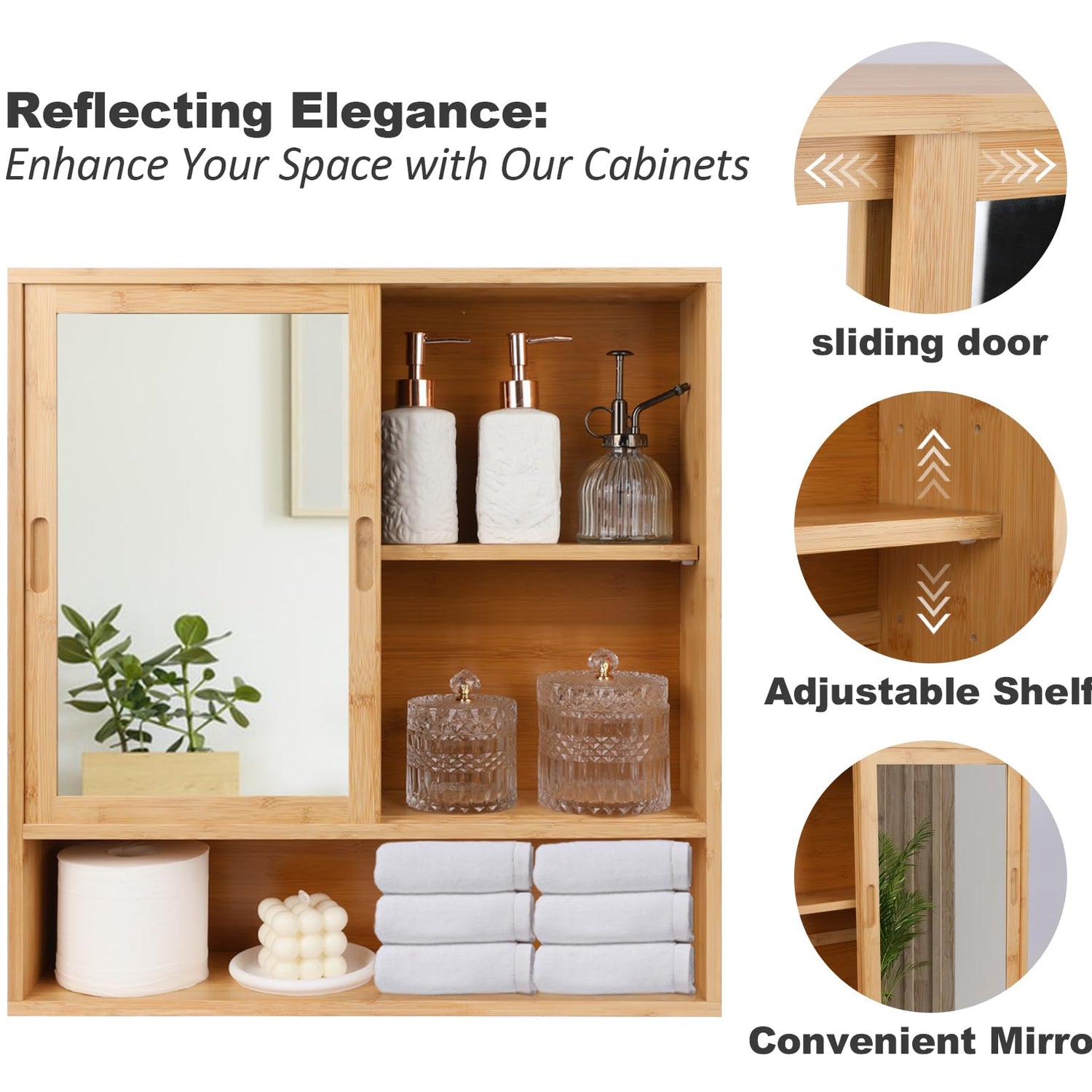- 【2 Convenient Sliding Mirror Doors】- Our bamboo mirrored medicine cabinet features 2 sleek sliding doors with integrated mirrors. Not only do these 2 sliding doors save space, but they also provide easy access to your stored items. Simply slide the mirrored doors smoothly to reveal the contents inside and conveniently check your appearance before stepping out. The mirror also reflects light, creating a sense of openness and brightness in your bathroom.