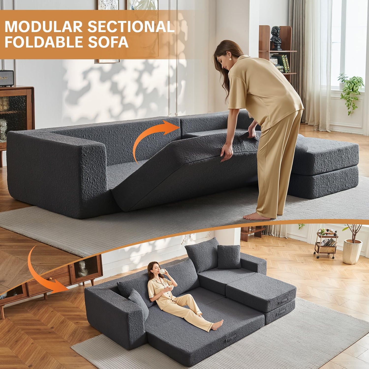 - Foldable & Transform Sofa: Unlock ultimate flexibility. Effortlessly convert this innovative design into a cushion, lounge chair, or spacious bed with one simple pull. Seamlessly transition from cozy sofa to guest-ready bed—ideal for daily relaxation or unexpected overnight stays. Enjoy instant adaptability and premium comfort, perfect for entertaining, reading, or movie nights.