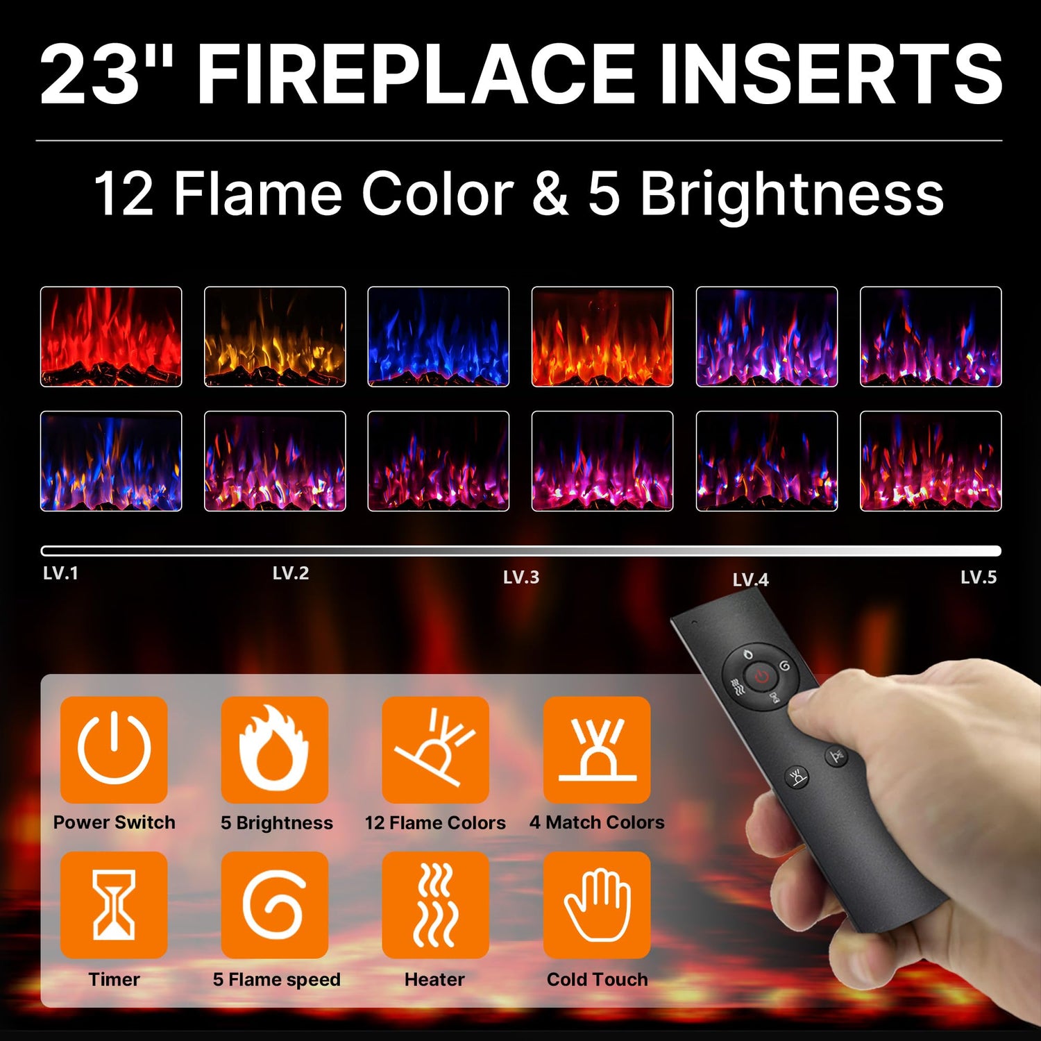 - Customizable Fireplace Insert: Experience cozy ambiance with a 23” ETL-certified insert featuring 12 flame colors, 5 adjustable brightness levels, and 5 flame speed settings. Choose between 750W and 1500W heat modes, or enjoy the stunning flame effects year-round — with or without heat. Convenient 8-hour timer included. Easily control all settings via the touchscreen or remote control