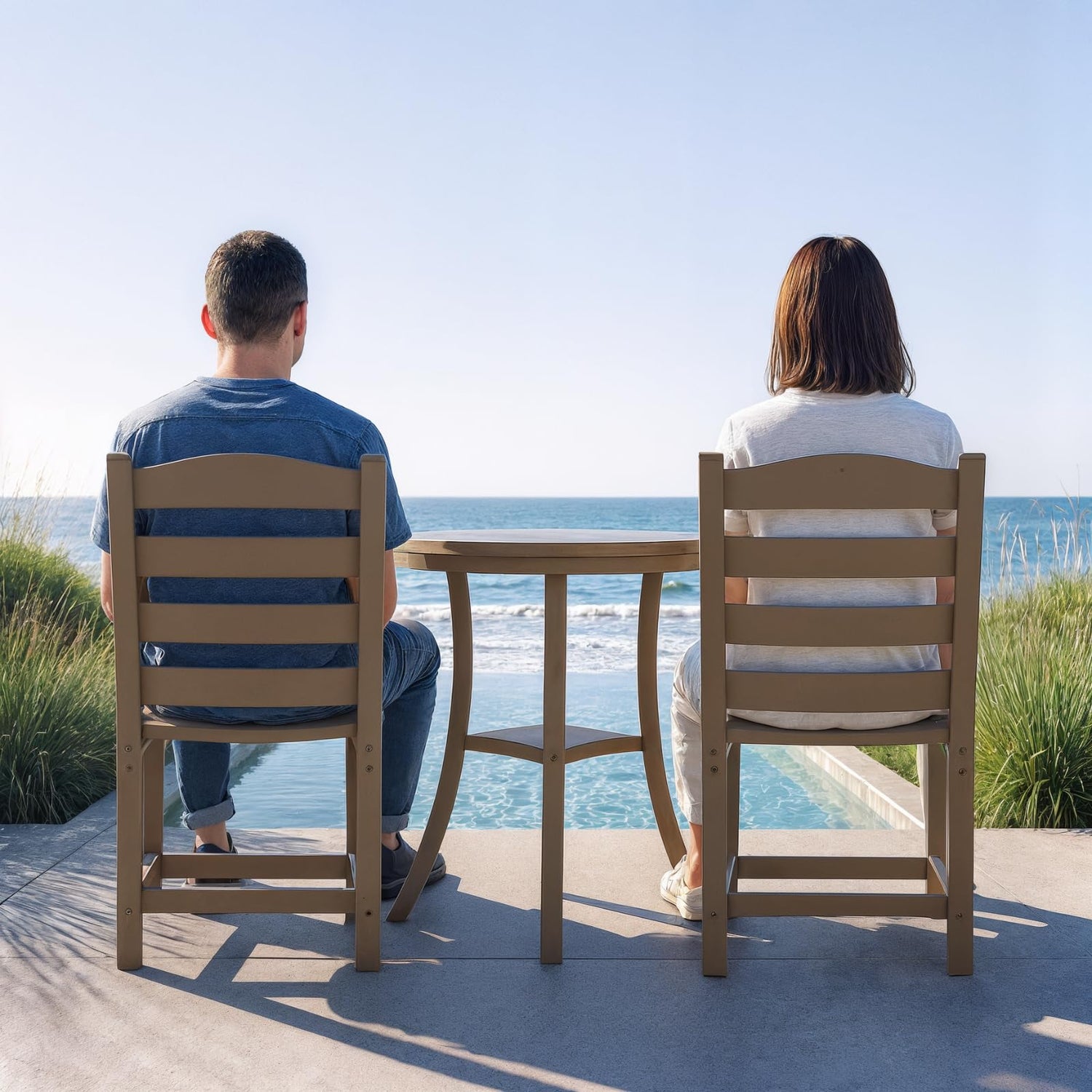 Constructed from all-weather HDPE material, it withstands sun, rain, and humidity without fading, rusting, or molding. With its wood-grain texture and low-maintenance design, this bistro set brings both comfort and timeless style to your outdoor living space.