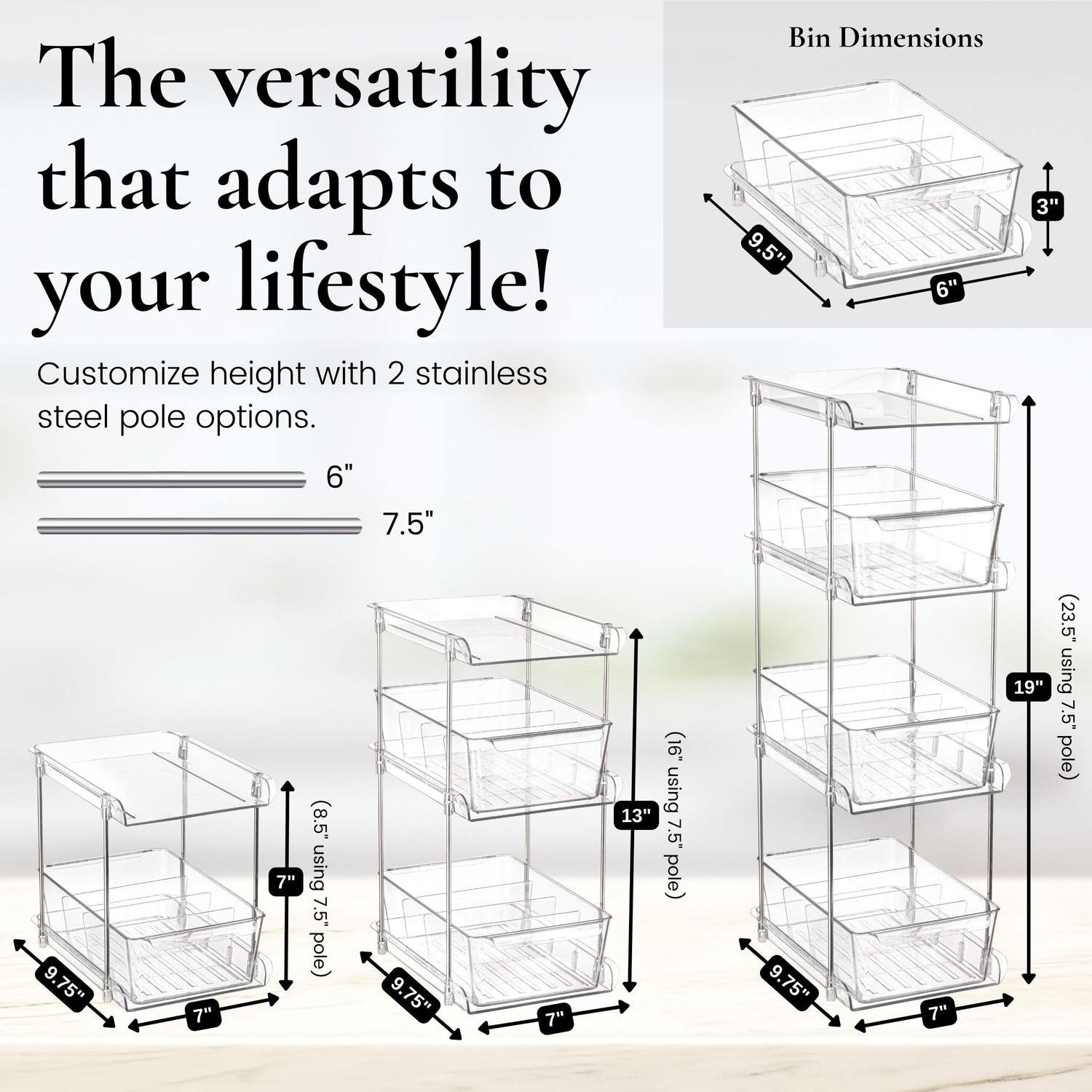 - VERSATILE ORGANIZATION - Elevate your space with our 3-tier clear organizer (10"L x 13"H x 6"W). Customize height and usage with 2 different size stainless steel pole options (8x 6"H and 8x 7.5"H). Our organizer offers true freedom in design - a 2-tier, 3-tier, or 4-tier setup. Create your ideal under sink bathroom storage solution, customize it to your heart's content, or keep it as shown. under the sink bathroom organizer