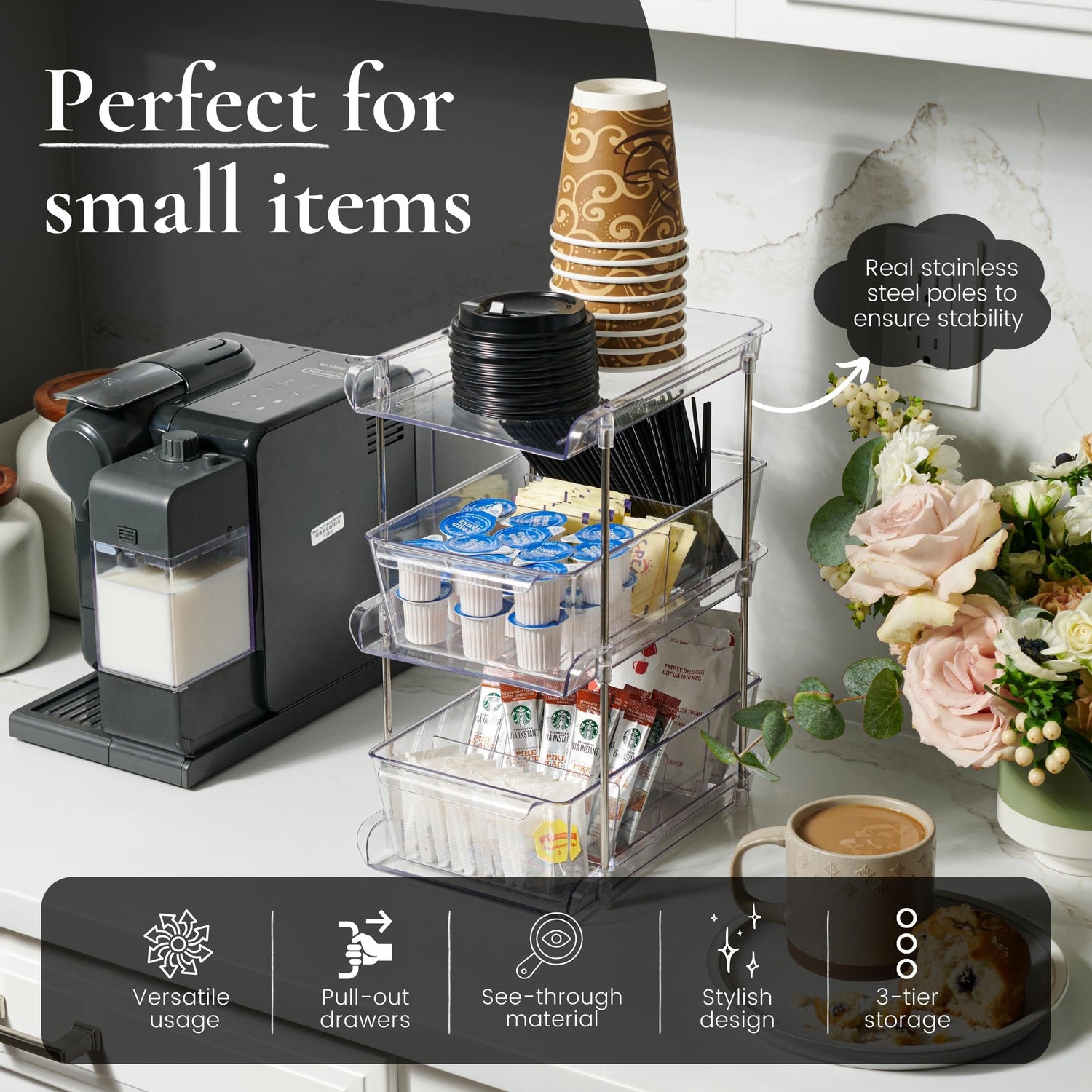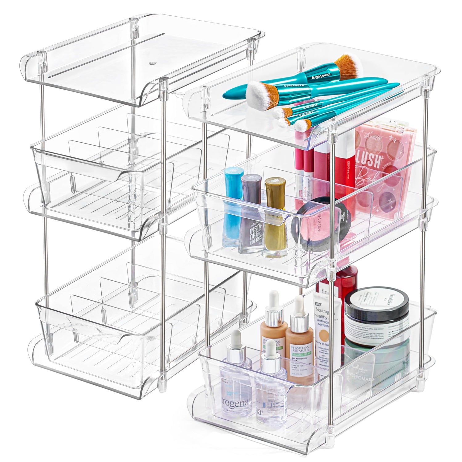 - ELEVATE YOUR BATHROOM - Our stylish 3 tier clear organizer stackable under sink organizer with pull-out drawers is perfect for under sink bathroom organizers and storage and bathroom sink organizer under cabinet. Organize bathroom essentials, under sink organizers, and storage.