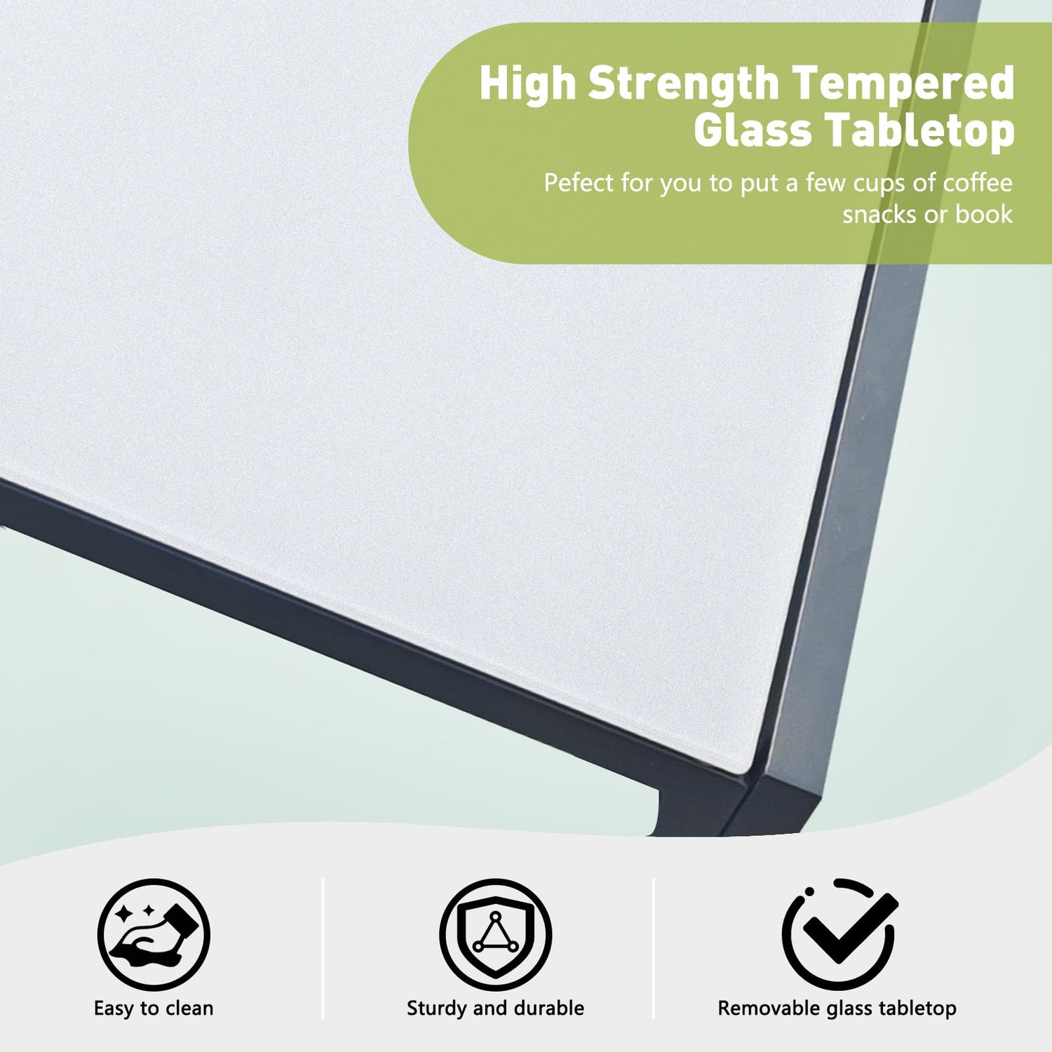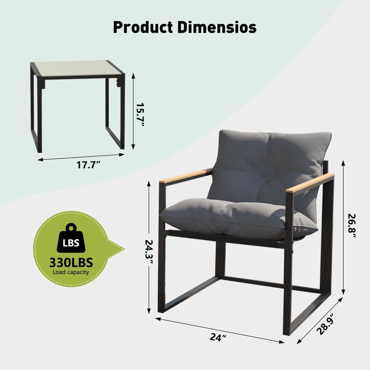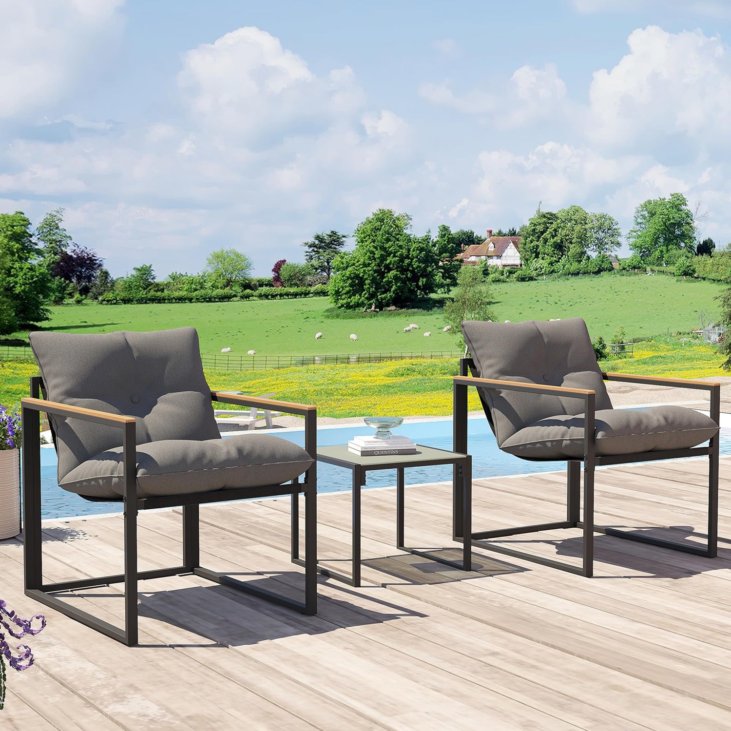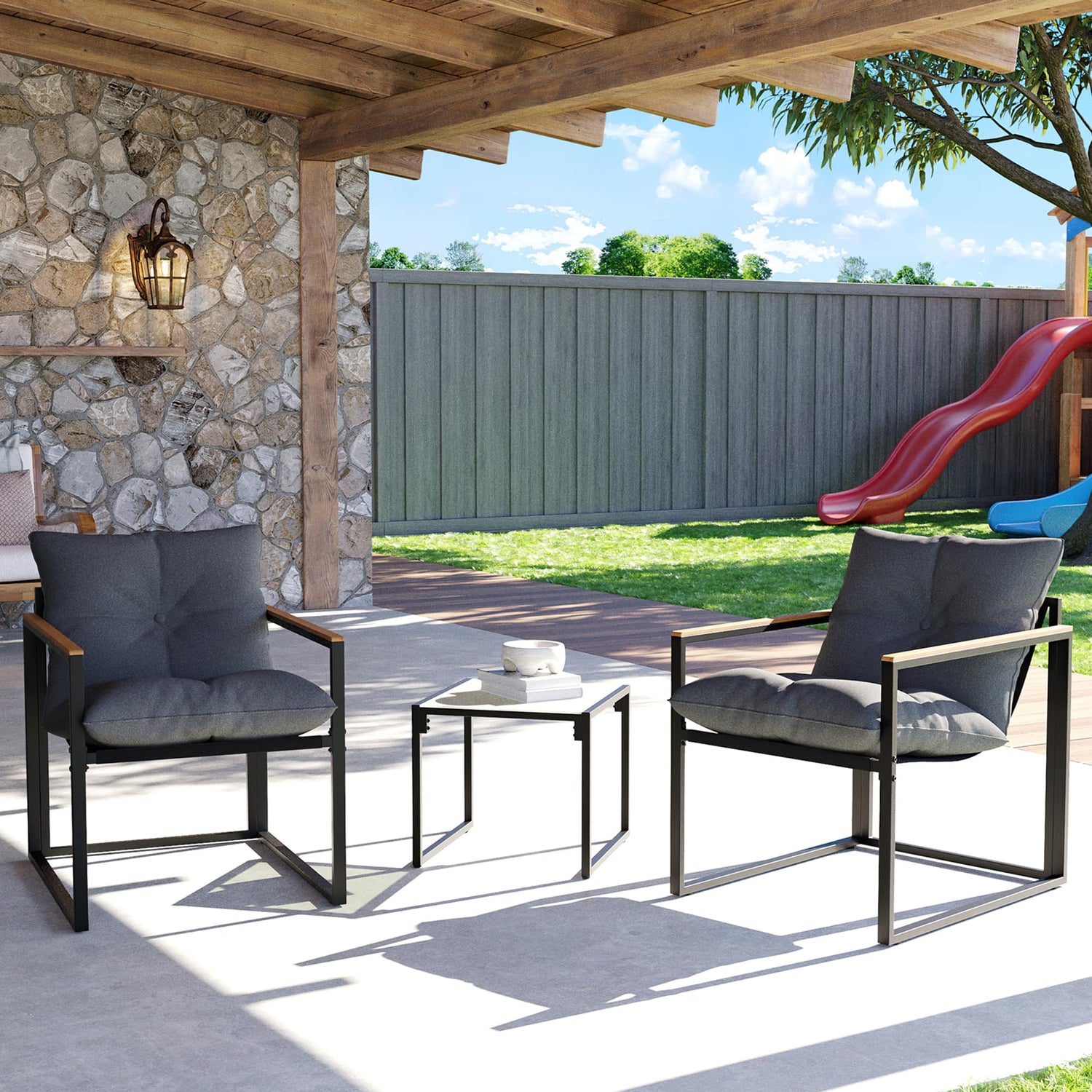 - COMFORTABLE AND PRACTICAL: This patio bistro set includes two spacious steel chairs and a glass coffee table. The chairs are made of breathable, cool Textilene fabric with thick cushions for year-round comfort