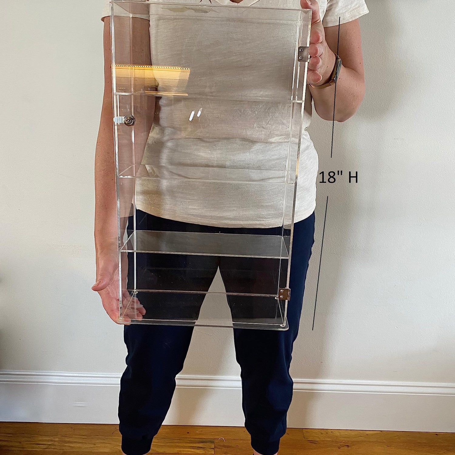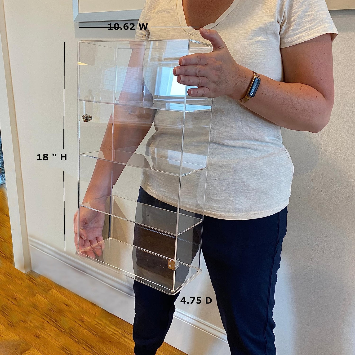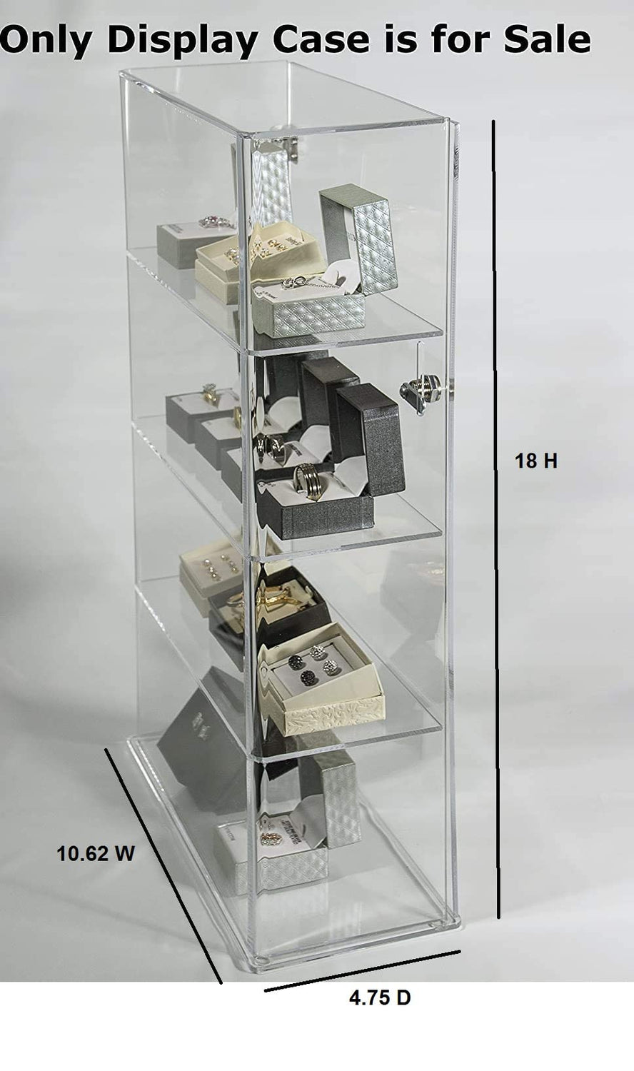 Details: Acrylic transparent cabinet will help you to do this. Its fine and clear design shelf to display all your small and medium expensive products.And with its well built strong steel hinges door moves smoothly and steadily with longer durability. With a lock and two keys. This lock box display case provides a safe and dust-free place to store and display valuable collectibles! It can effectively avoid the damage Its light weight and transparent material can match any decoration style Ideal for displaying products like jewelry, watches, antique pieces and collectables, even food such as cupcakes or other small pastries. Ideal for countertop displays, simple and fashionable items, market stalls, craft fairs, exhibitions, home and office.The surrounding panels are crystal clear material to show the collectibles from all sides. Tiny on the base of the display to prevent sliding Specification. Dimensions: 10.625 W x 4.75 D x 18H.Height between each shelf 4.375 inch Shelves are spaced at 4.5 inches.