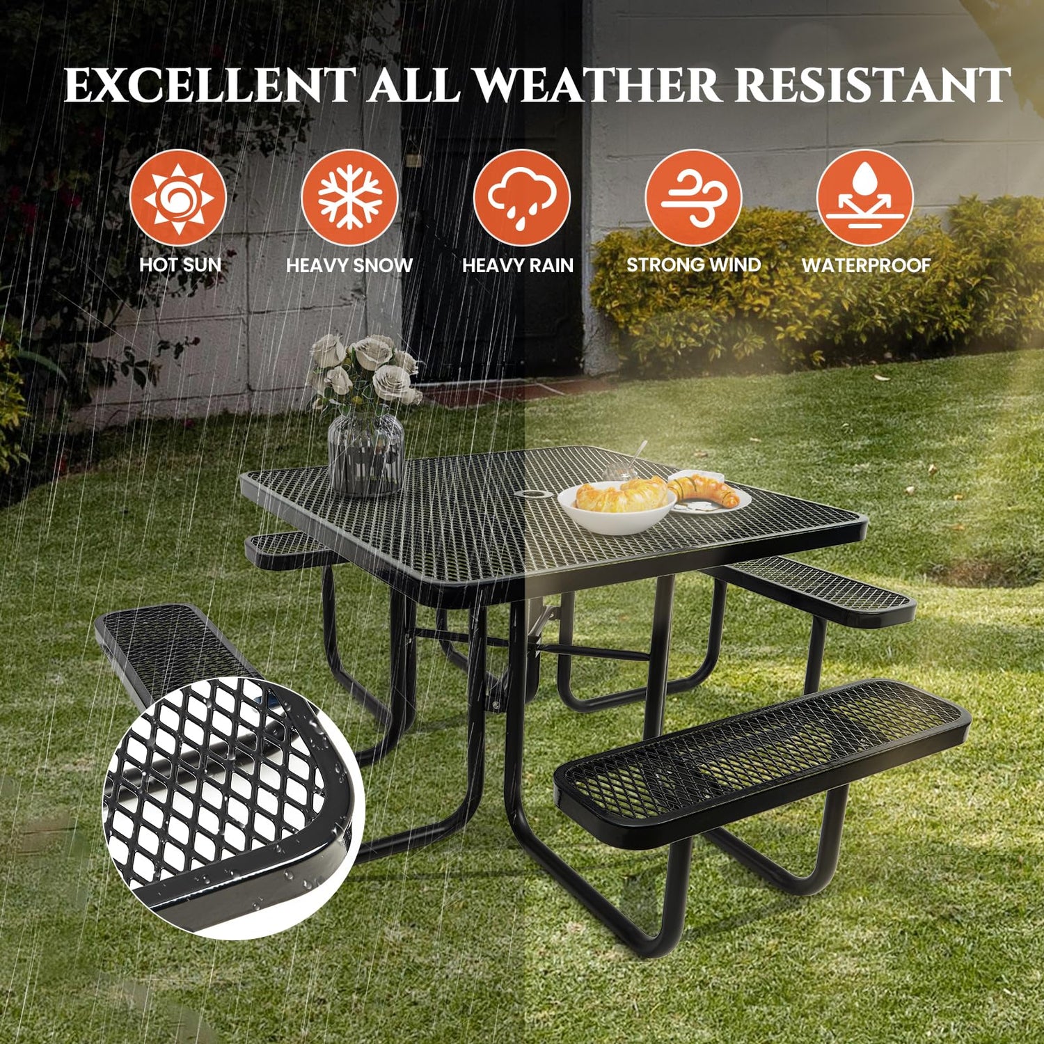 47'' Heavy-Duty Metal Picnic Tables with Umbrella Hole, Outdoor Steel Heavy Duty Commercial Grade Black Table, Outdoor Bench Set for Lawn, Patio, Park, Yard, Garden, Porch (Set A, Square)