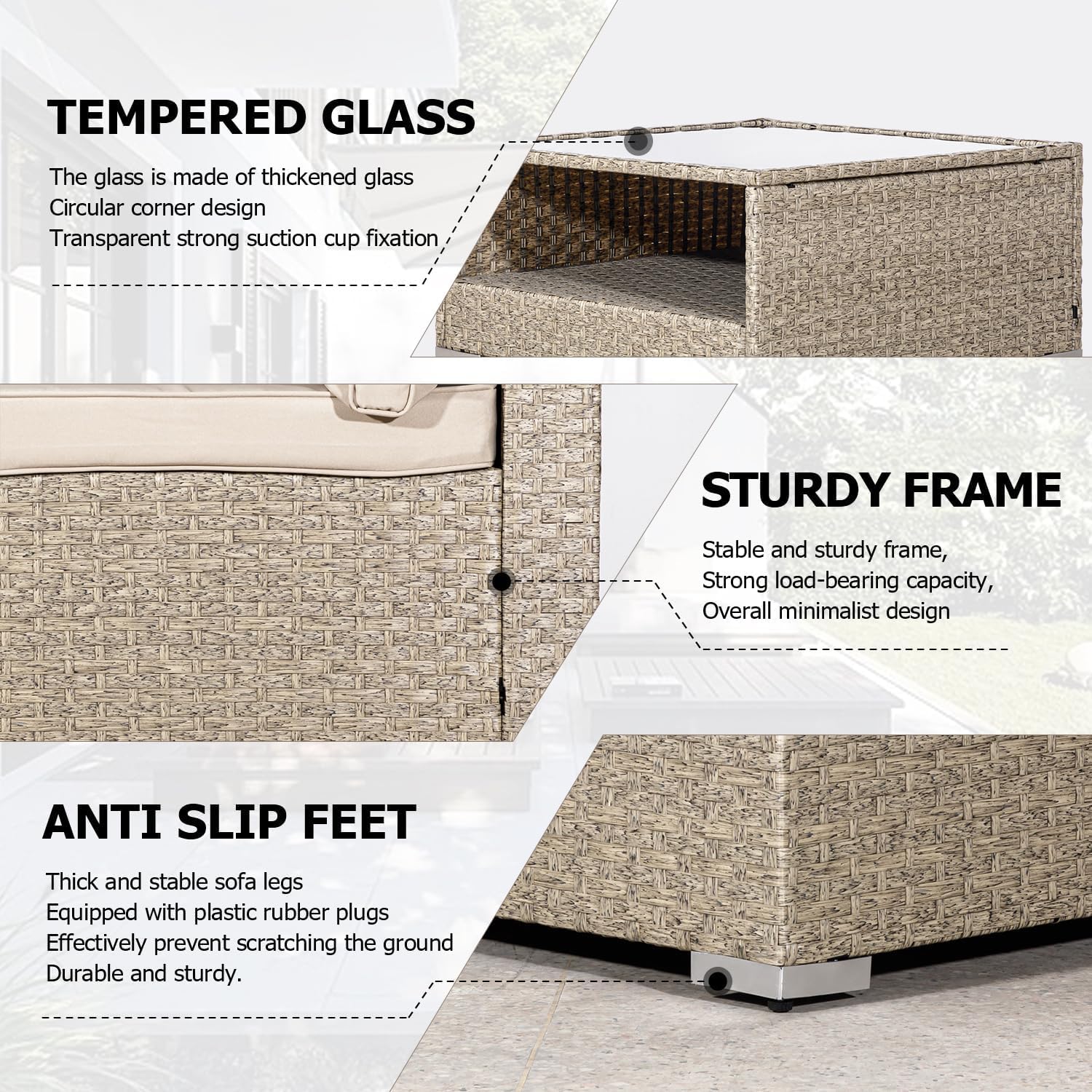 • Ample Storage Solutions: Our outdoor sectional with storage is designed to keep your outdoor space tidy and organized. With hidden storage compartments, this outdoor sectional sofa allows you to store cushions, blankets, and other accessories, ensuring your sectional patio furniture set remains clutter-free.