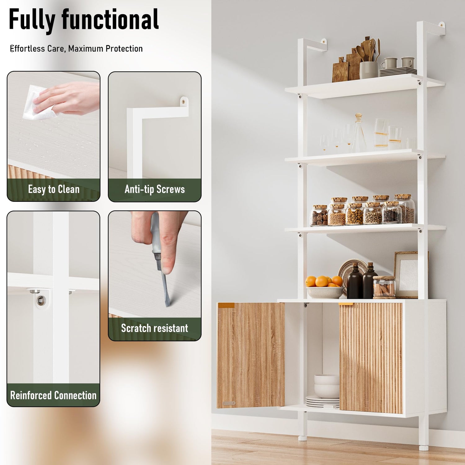 - 【Multi-Functional Storage & Space-Saving】Featuring a 5-tier open ladder bookshelf and a bottom enclosed cabinet, this wall mounted bookshelf offers both display and hidden storage options. Perfect for showcasing books, plants, and decorative items while neatly storing everyday essentials. Its vertical structure maximizes space without occupying much floor area—ideal for living rooms, bedrooms, home offices, or studies.