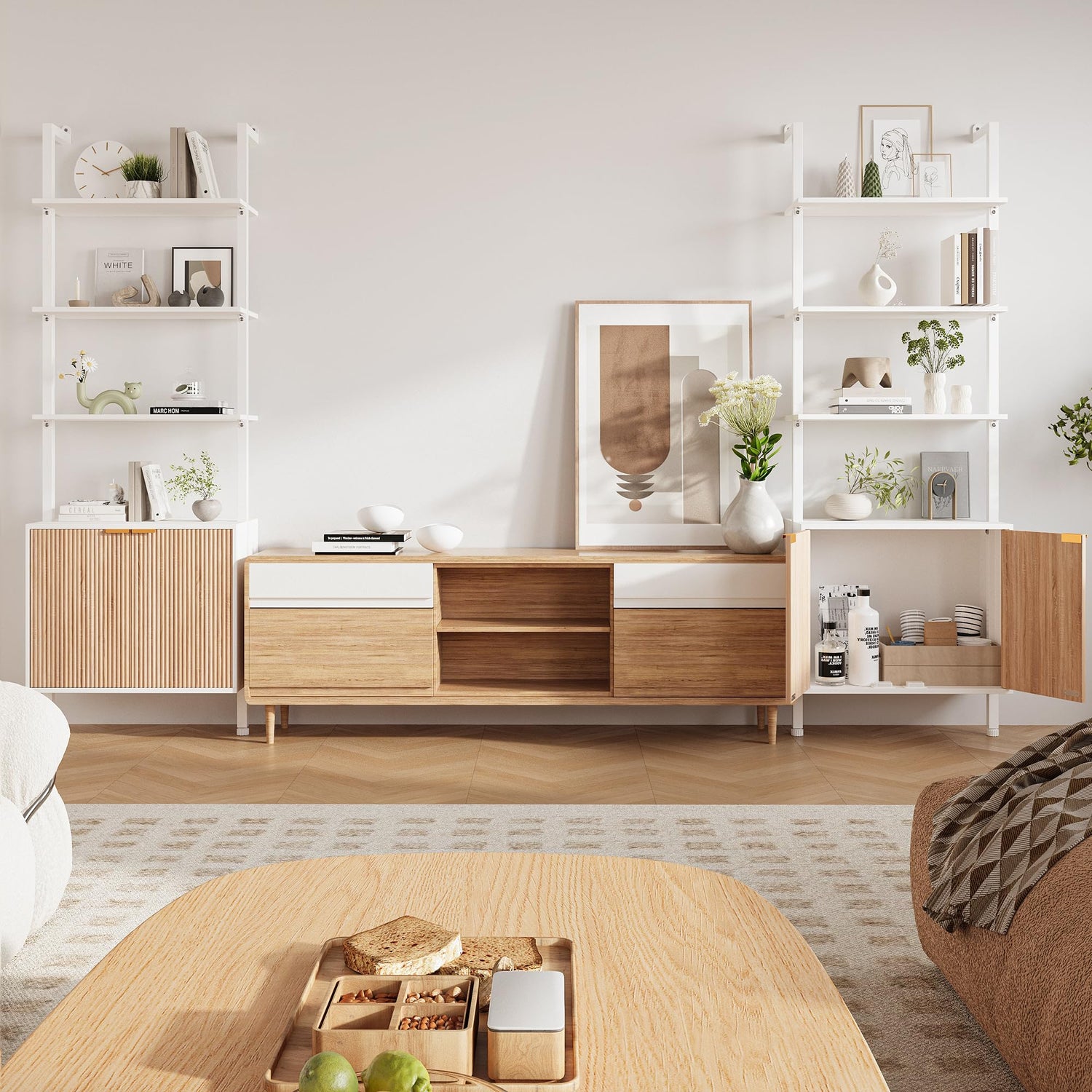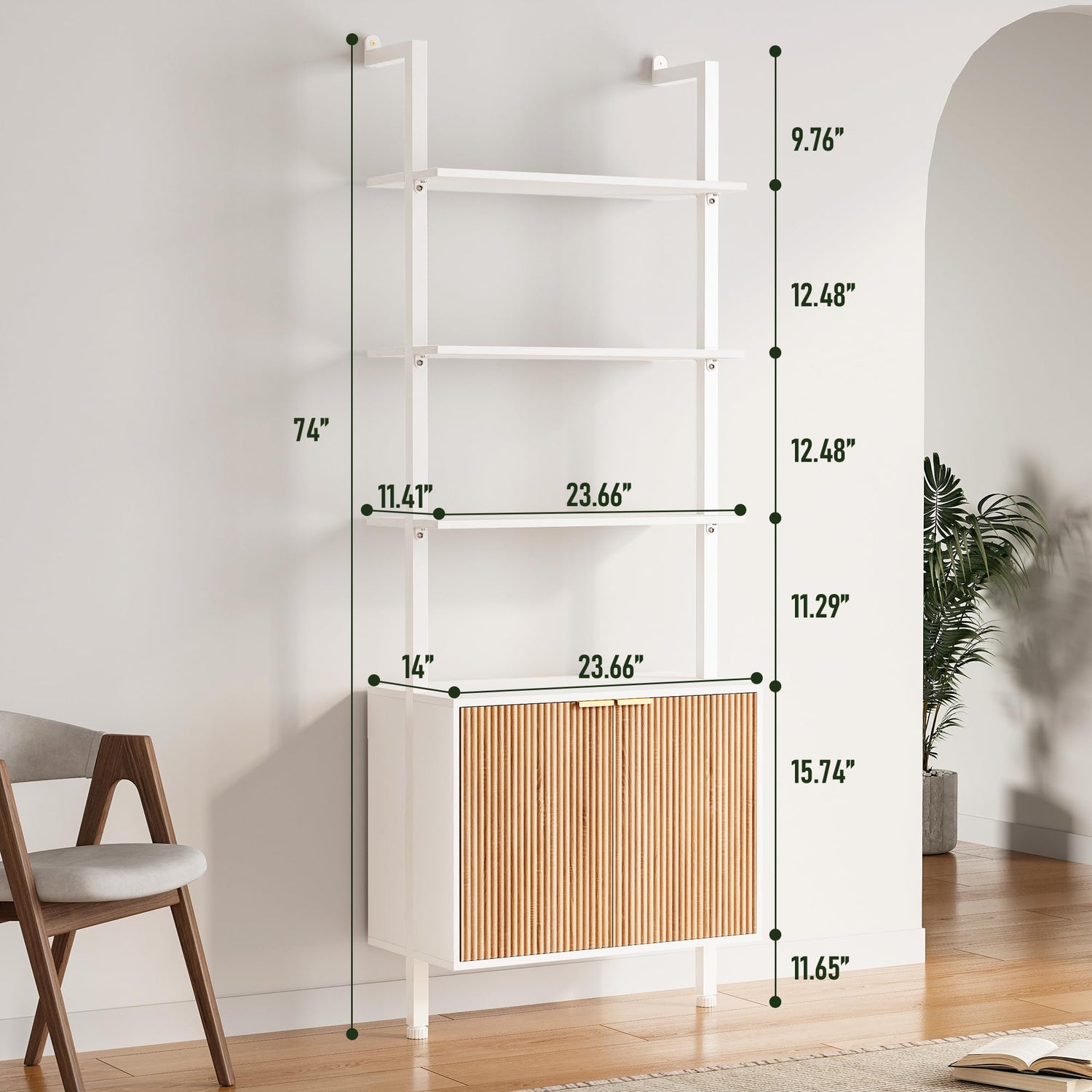 74" Tall Bookshelf with Storage Cabinet, Modern Ladder Shelf with Wood and Metal Frame, Wall Mount Bookcase Open Display Shelf Furniture for Living Room, Bedroom, Home Office, White and Oak