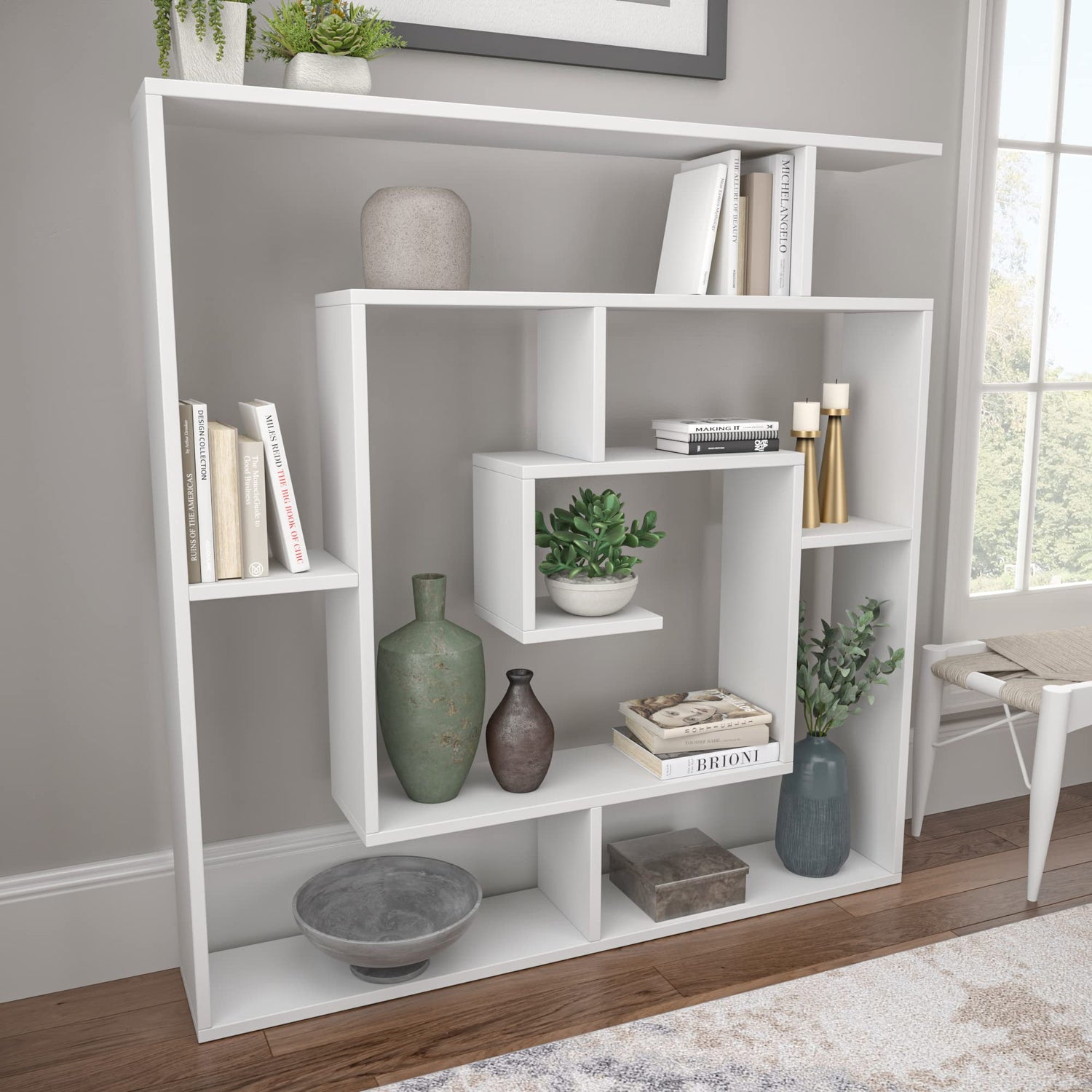 Details: Briscoe Modern Bookcase - Bookshelves 49'' x 51'' x 8.5'' Shelving Unit, Bookshelf Unit, Book Shelf Organizer for Living Room, Office or Bedroom - Libreros de Madera Modernos Estanteria