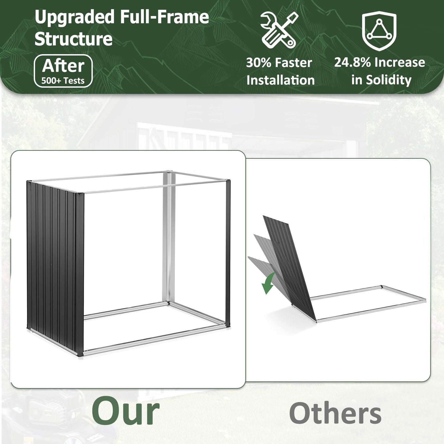 - 【Advanced Frame Design】AirWire outdoor shed introduces an improved full-frame construction. It's been thoroughly tested, resulting in an average 30% improvement in both ease of installation and overall stability, designed with your convenience in mind.