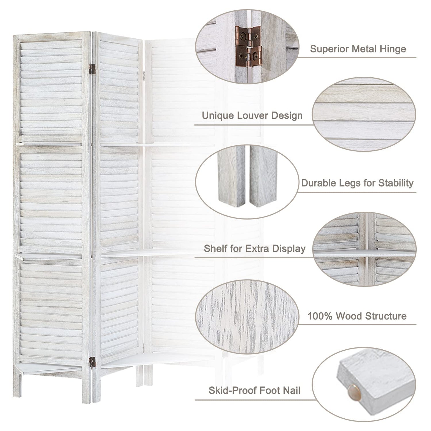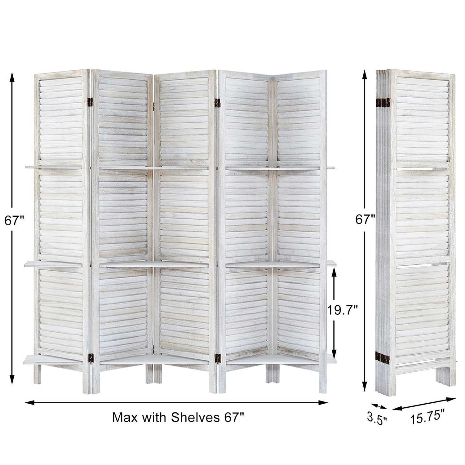 - Room Dividers with Shelves: The portable panel screen is built on solid wood, features a stylish louvered slat with 3 manufactured wood shelves to display your favorite decoratives while creating a smaller enclosed private space within a corner or along a wall.
