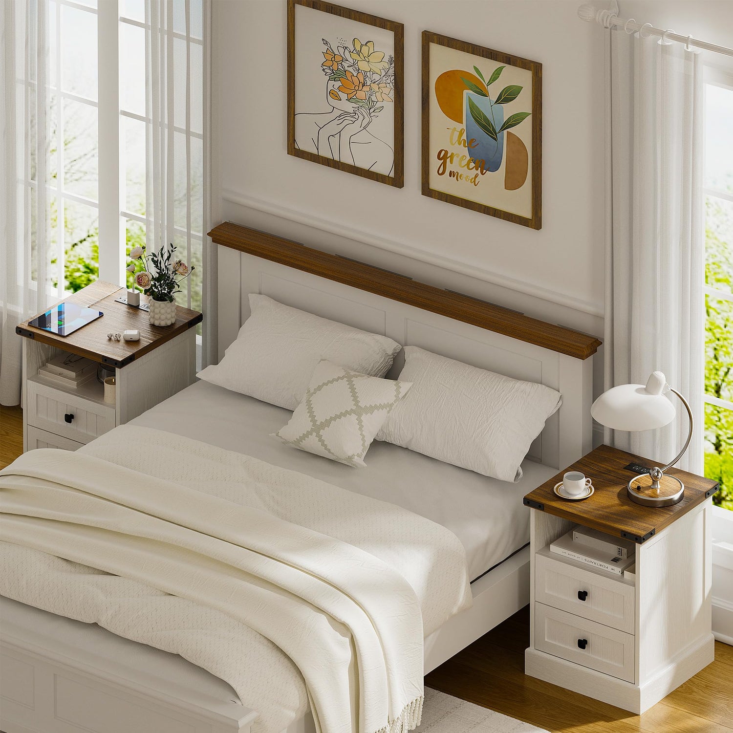AntsandAnts White Farmhouse Nightstand Set of 2,Wood End Tables Bedroom with Charging Station,Metal Corner Night Stand with 2 Drawers for Living Room,Bedside Table Furniture