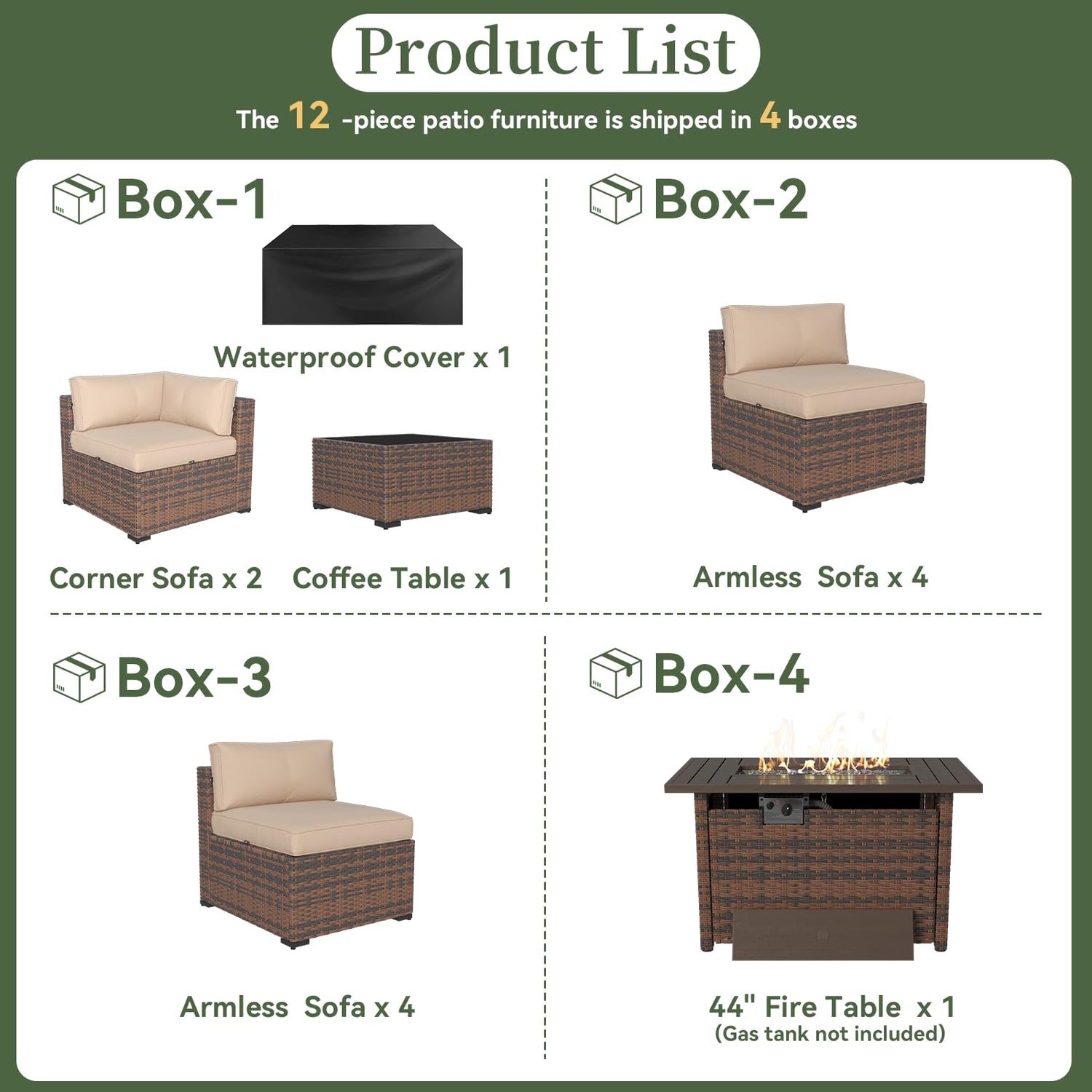 Details: Transform your patio into the ultimate warm space for unforgettable gatherings with the Aoxun 12 Piece Patio Furniture Set with Fire Pit Table! This set is the perfect choice for you. Imagine the joy of sitting on a sectional couch and enjoying the warmth of a propane fire pit table while you're gathering with friends! Specification:Material: Wicker Rattan & SteelStyle: GardenColor: BeigeCertification: CSAPackage Includes:Armless Sofa x 8Corner Sofa x 2Coffer Table x 144” Fire Table x 1Furniture Cover x 1Note: Propane Tanke is not included