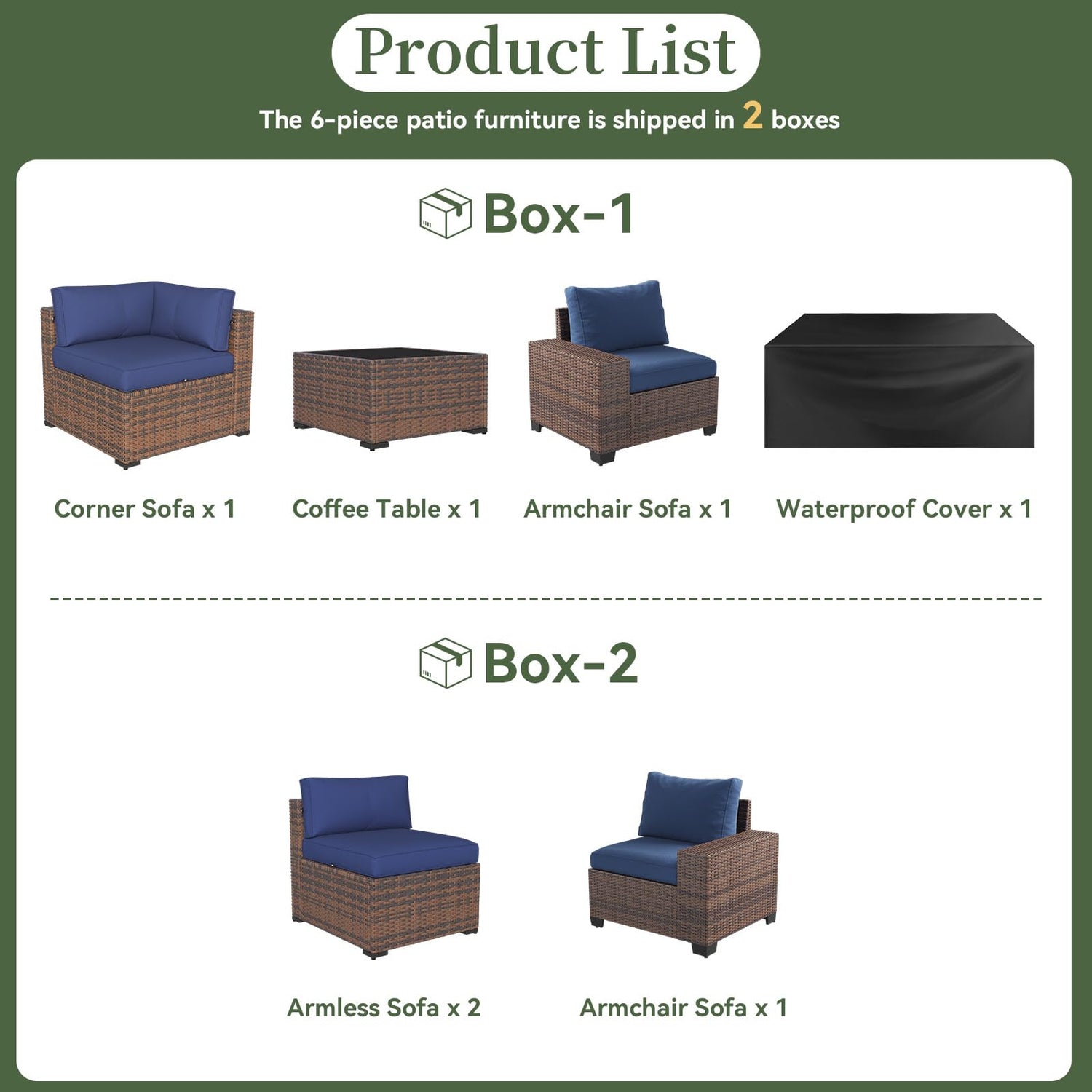 Details: 6 Piece Patio Furniture Set with Wide Armrests Wicker Rattan Outdoor Sectional Sofa Set with Coffee Table and Thickened Cushions, Brown/Blue(Waterproof Cover Included)