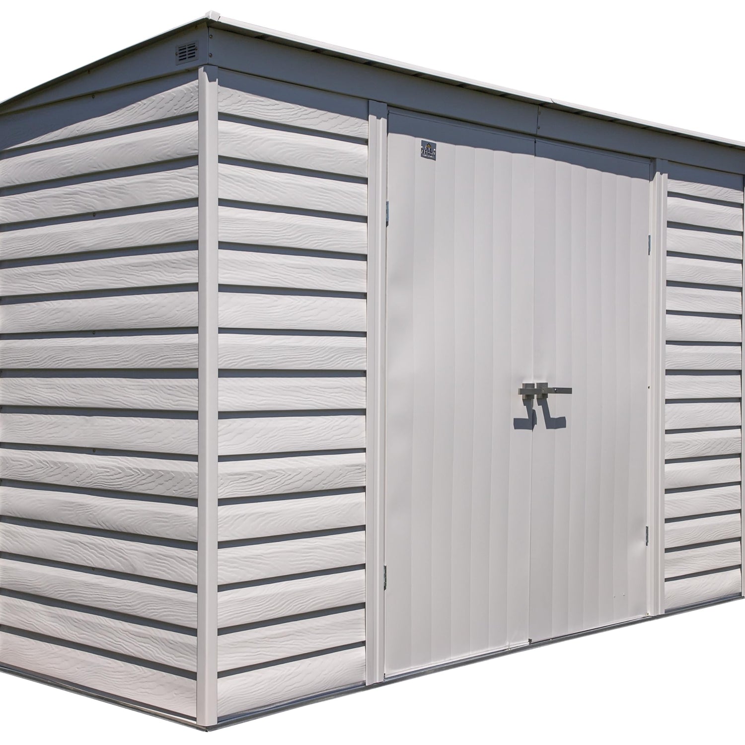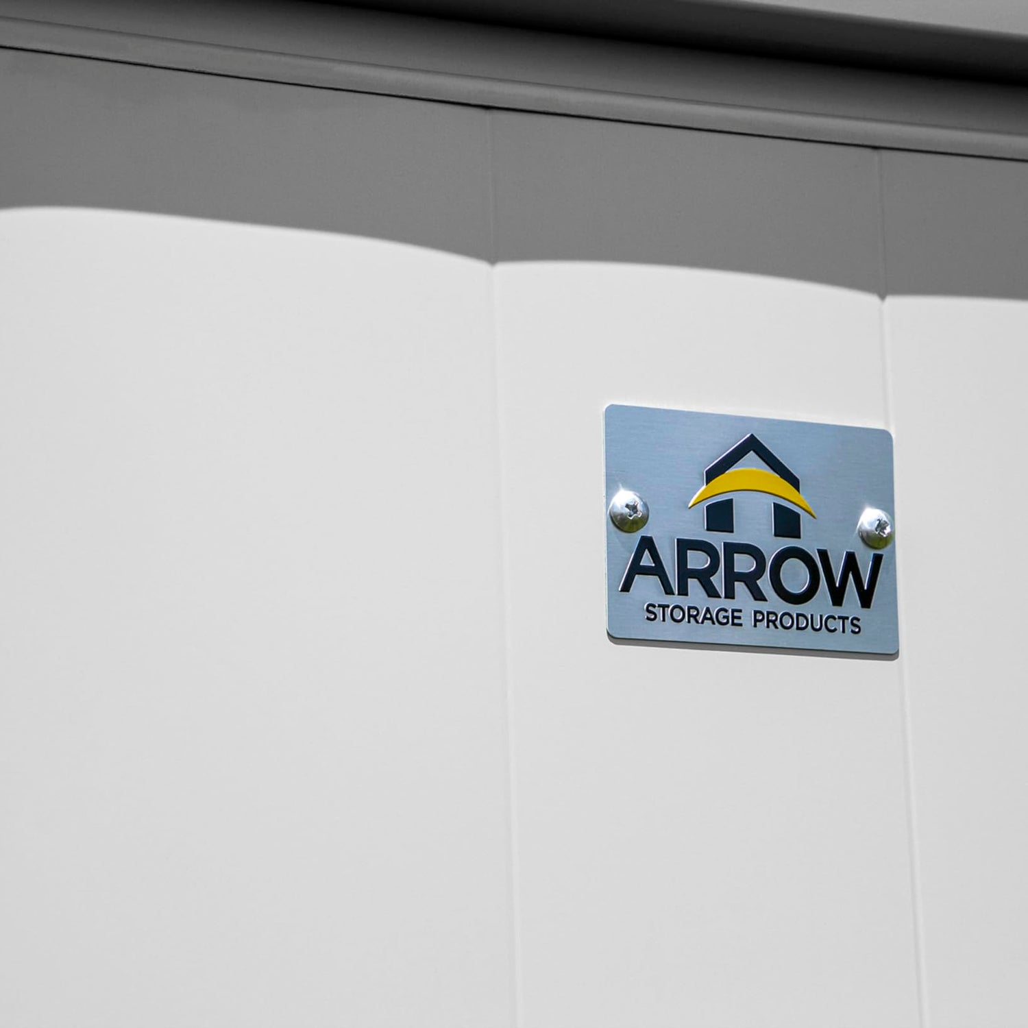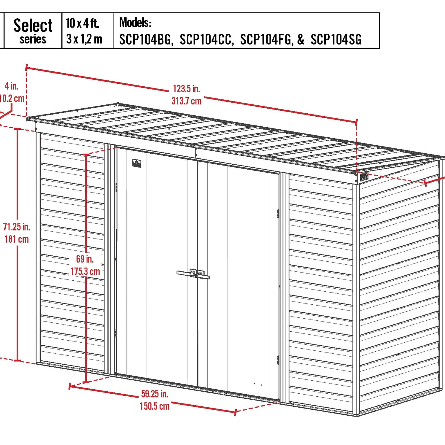 Details: The Arrow Select Outdoor Lockable Steel Storage Shed Building will add an attractive and functional storage space. This 10’ x 4’ steel storage building is engineered with a sturdy steel material that undergoes a galvanization process to provide protection for your stored tools, gardening supplies, and lawn equipment. Constructed from galvanized steel, the Arrow Select Storage Shed is a long-term storage option for your property. This heavy duty steel protects against the elements, while maintaining its appearance. Finished in a smooth paint textured finish, this helps provide additional safeguarding against harmful weather, rust, and corrosion. This reliable storage building is designed with a tall pent roof for added headroom and horizontal siding panels give it a classy presence. The metal shed features tall 71 inch wall panels to help store taller items, like rakes and pole saws. With the 59.25 inch wide x 69 inch high shed entrance, you can easily access the shed's interior and retrieve items effortlessly. The sturdy wide doors allow easy access to the interior of your storage shed, while also allowing storage against the front wall. Protect your items from theft with the lockable swing shed doors, which feature a brushed nickel key lock handle. You can store your lawn mower, seasonal patio furniture, pool accessories, and more with peace of mind. In addition, gable vents provide increased air flow to the shed's interior. The shed is designed to add aesthetic appeal to your property and has a neutral Flute Grey finish to effortlessly complement your home and yard. It pairs seamlessly with a wide range of home colors and gives a modern appearance. The Arrow Select Shed comes ready to assemble with pre-cut and pre-drilled parts. We recommend at least 2 people for assembly and to set aside 6+ hours. Proudly made in the USA with globally sourced material. The outside storage shed measures 123.5" W x 47" D x 77" H with 35 sq. feet of storage space.