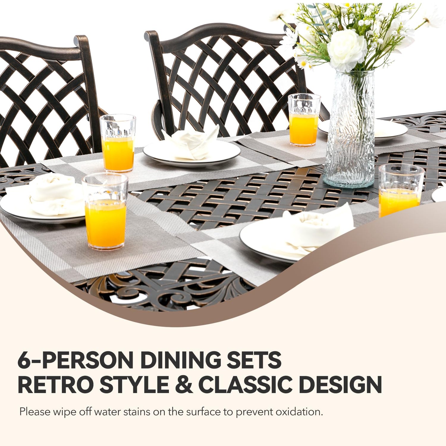 Attliasalon Outdoor Dining Set Cast Aluminum Retro Patio Dining Set with Thicker Cushion and Umbrella Hole for Patio Deck (Bronze Stackable Chair(Lattice), 7 Pcs(59" Rectangular Table))