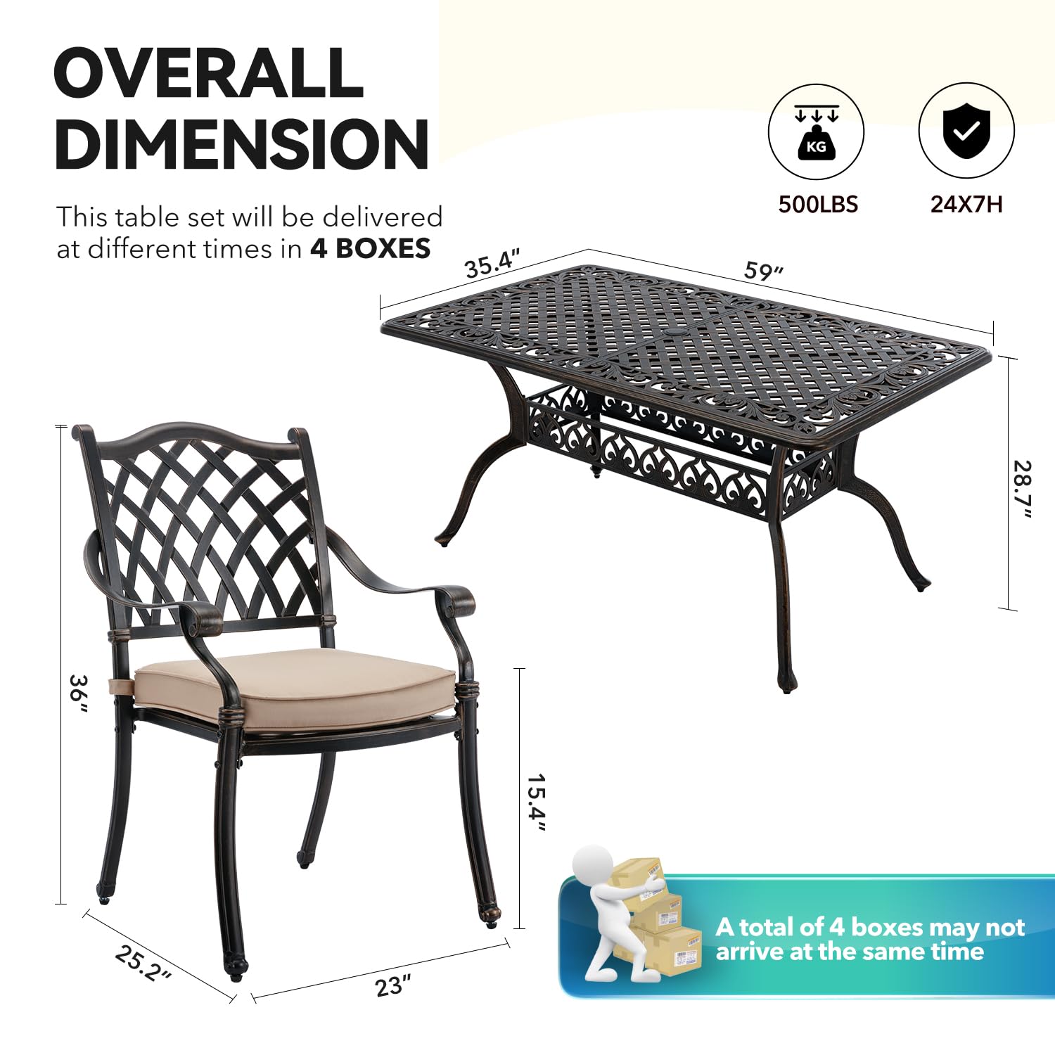 - WEATHER RESISTANT CAST ALUMINUM: Fearless of the elements, this cast aluminium patio dining set will prove its reliability over time. The surface powder coating process makes the outdoor dining set rust-resistant, weather-resistant, fade-resistant and other features, and the carefully sprayed vintage bronze finish still maintains its classical beauty even as the years go by