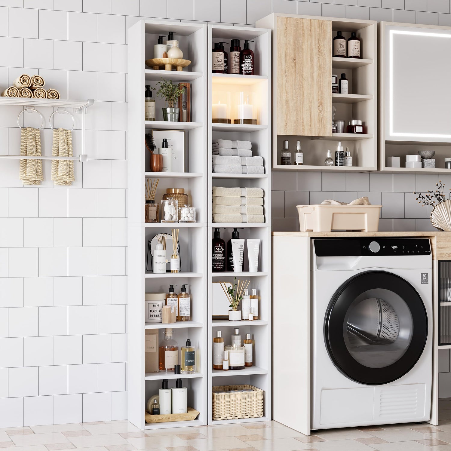 Bamjoy 71 Inches Tall Narrow Bookshelf, 8-Tier CD DVD Slim Media Tower Rack, Corner Bookcase with Adjustable Shelves, Skinny Cubes Bookshelves for Home Office Small Space, White