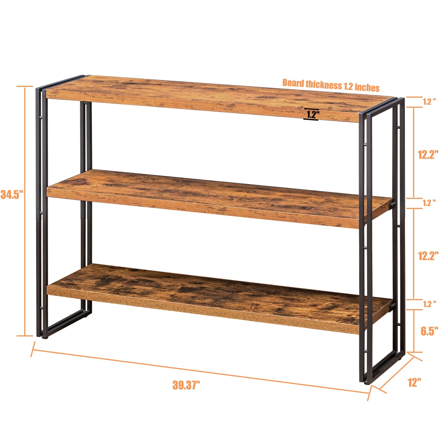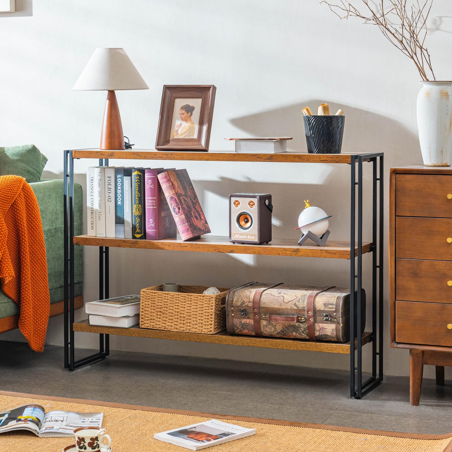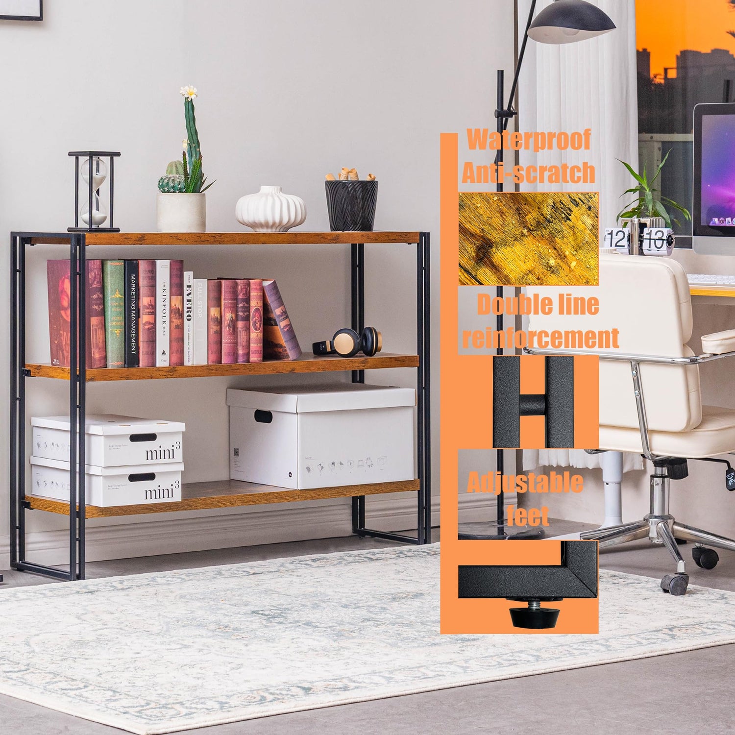 BCLOUDNEST Bookshelf, 3 Tier Horizontal Bookcase, Industrial Book Shelf for Living Room, Home Office, Kitchen, Rustic Brown