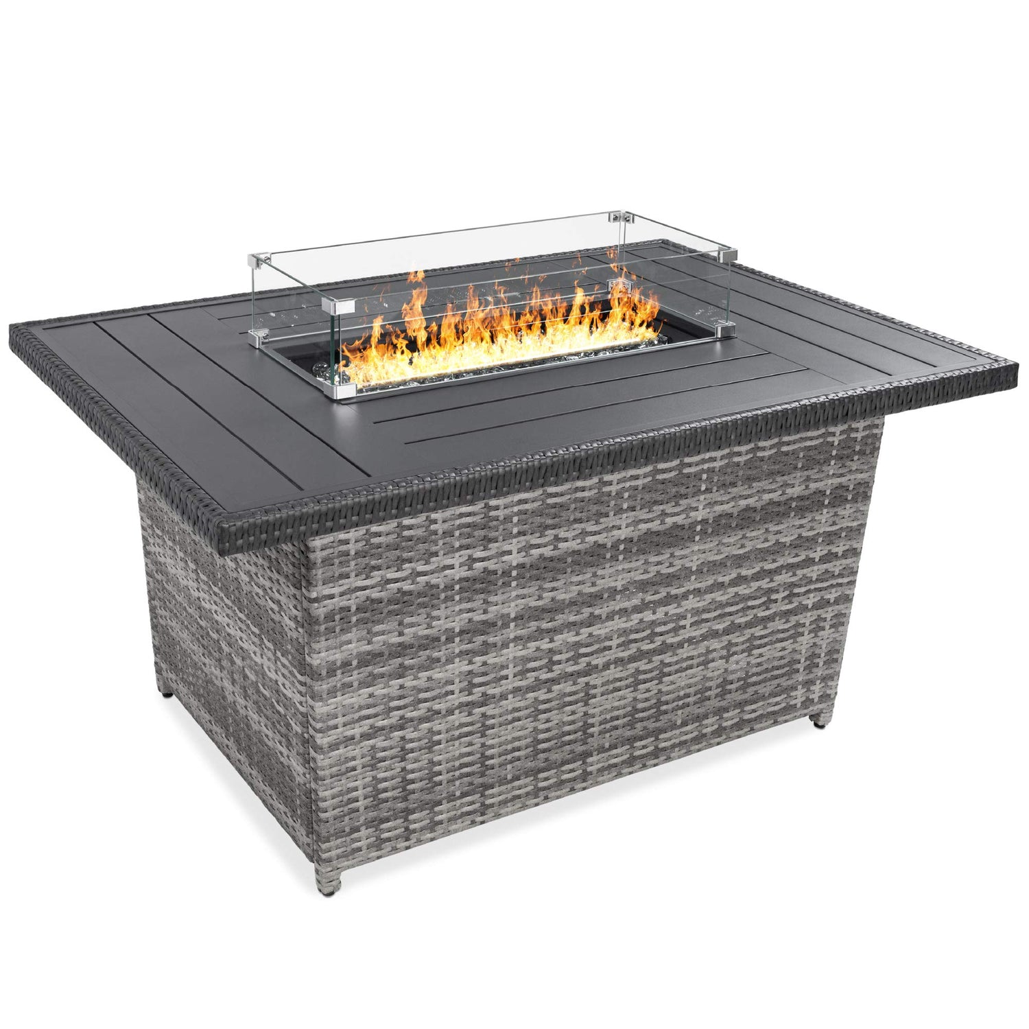 Best Choice Products 52in 50,000 BTU Outdoor Wicker Patio Propane Gas Fire Pit Table w/Aluminum Tabletop, Glass Wind Guard, Clear Glass Rocks, Cover, Slide Out Tank Holder, and Lid - Gray