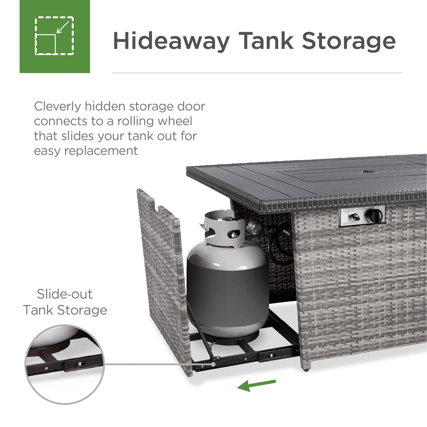 • CONVENIENT HIDEAWAY TANK HOLDER: Intelligently crafted with a pullout gas tank holder, so you can change your propane tank in a flash and tuck it away to stay completely out of sight; works with a standard 20-pound propane tank at 50,000 BTU
