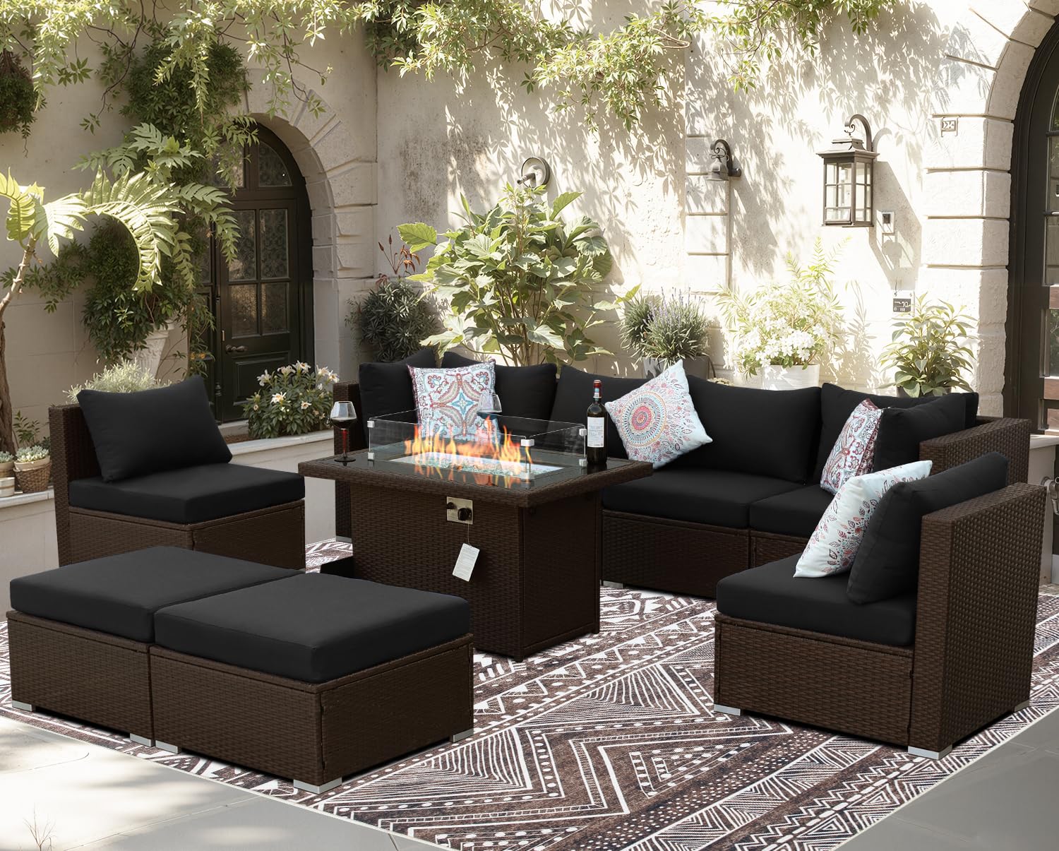 BULEXYARD 9 Piece Highback Patio Furniture Set with Fire Pit Table, Modern Modular Outdoor Sectional Couch Sofa with Ottoman, 8-Person Backyard Seating for Outside, Deck, Brown Wicker & Black Cushion