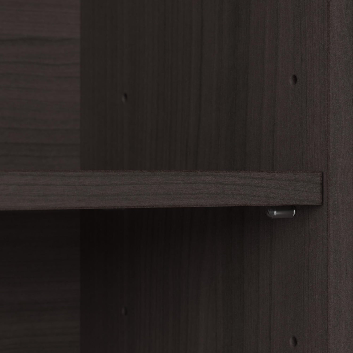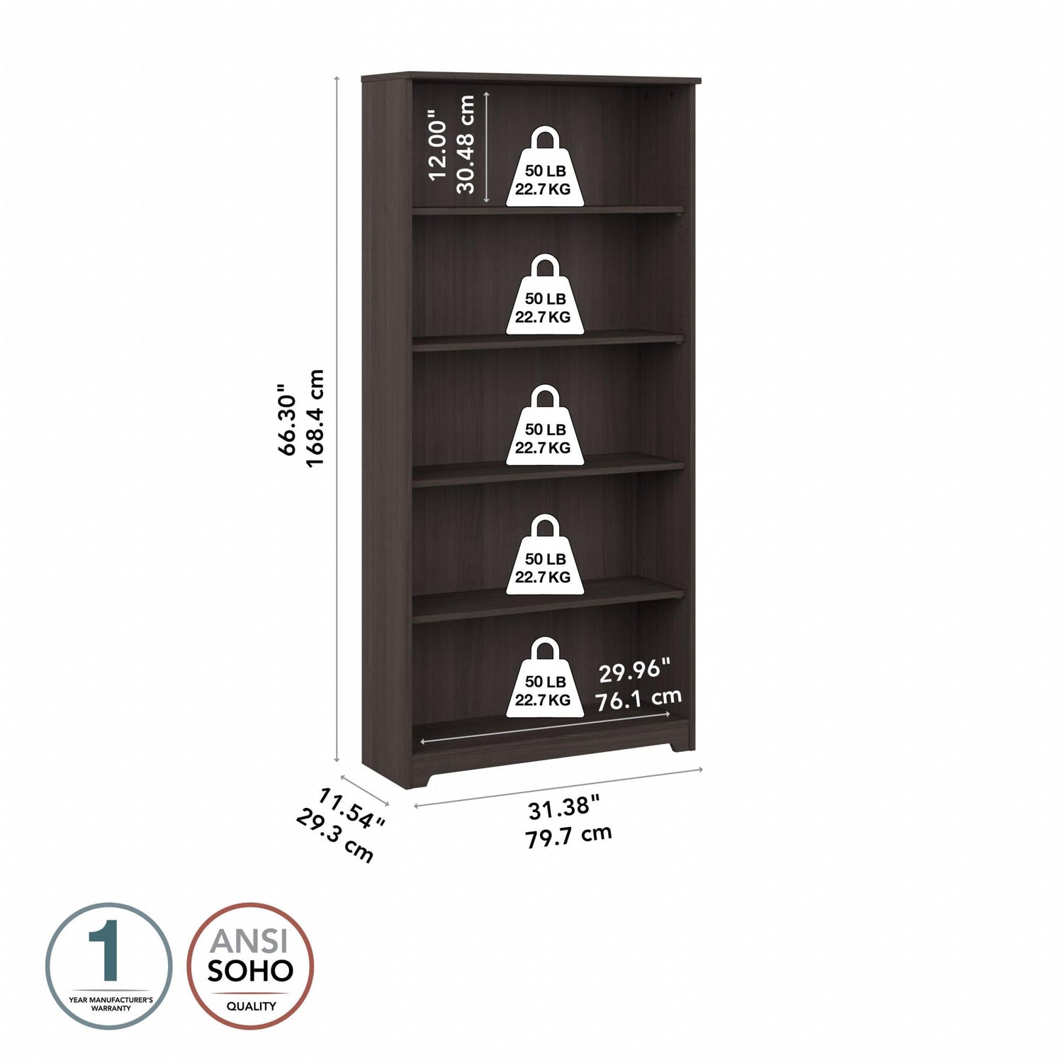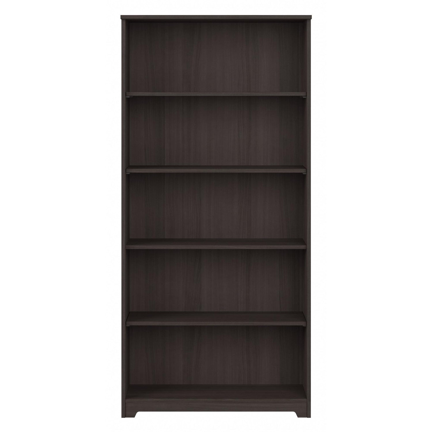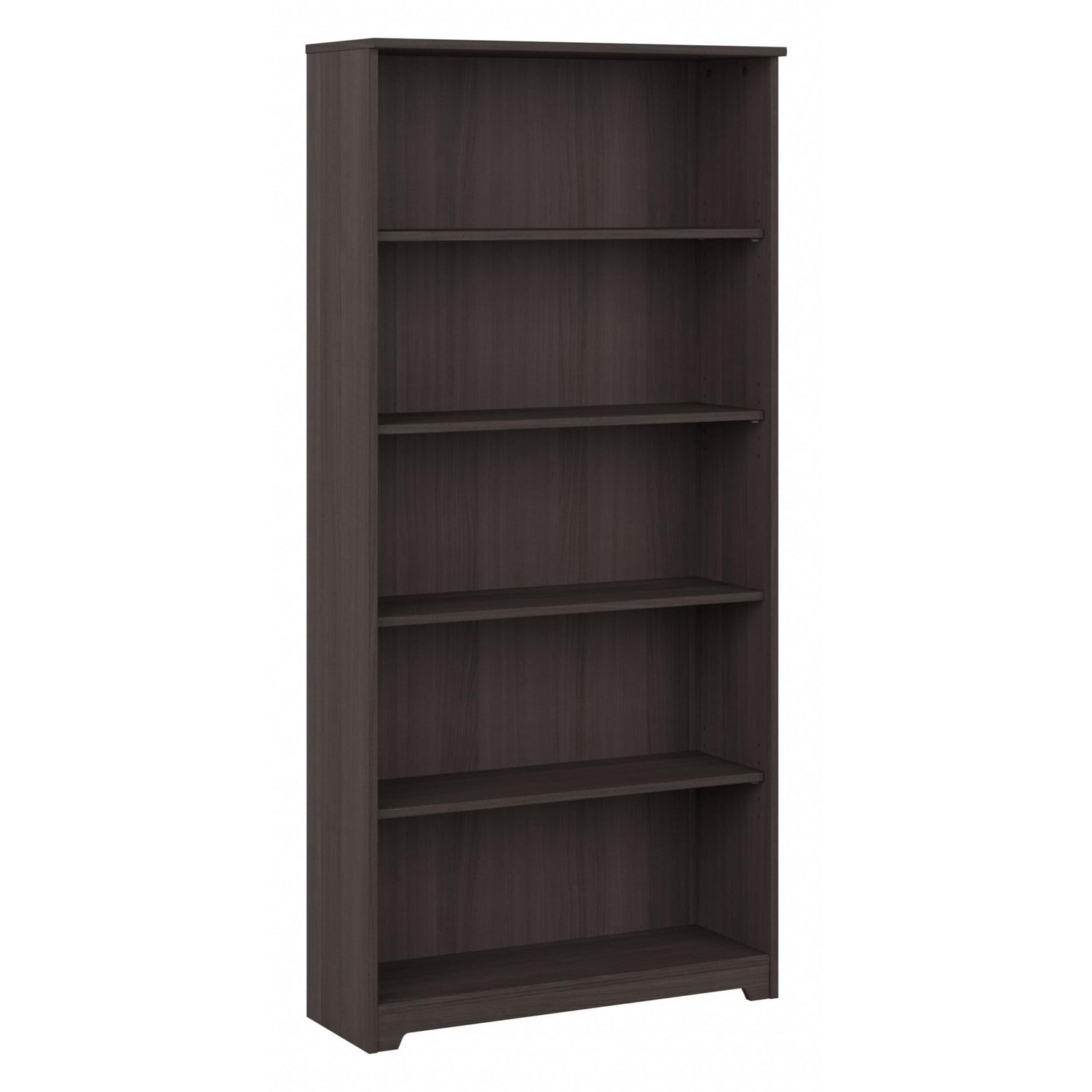 Details: This attractive Bush Furniture Cabot 5 Shelf Bookcase is perfect for the home office, living room or anywhere practical storage is needed. Its sleek profile and tall bookcase design mix style with function at a great value. Use one bookshelf on its own or group a few together to create a complete storage wall. The sophisticated, stable design has two fixed shelves for structural strength and three adjustable shelves that move up or down to accommodate items of various sizes. Each shelf supports up to 25 pounds, so you can confidently store a collection of paperback and hardcover books or brighten up the room with your favorite decorations. Wall attachment hardware is included for family-friendly safety and security. The stylish and timeless design comes in your choice of several traditional or contemporary finish options to complement any environment, and the Bookcase's height matches that of a Cabot Desk with Hutch (sold separately) for a coordinated appearance. This tall bookshelf is tested to meet ANSI/SOHO quality standards for safety and performance and is backed by the Bush Furniture 1 Year Manufacturer's Warranty. See the full collection for coordinating items available.