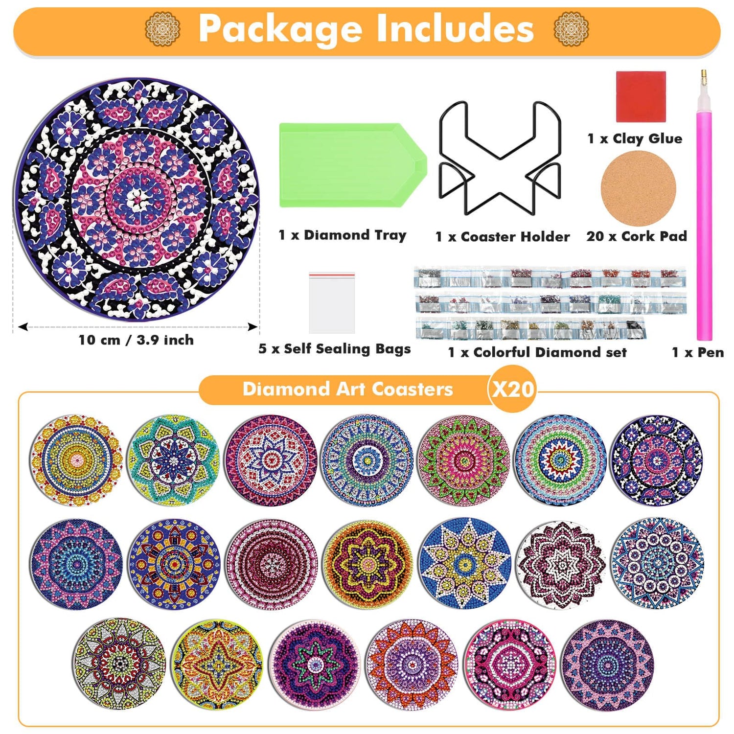 - What you will get: You will get 20 pieces diamond art painting coasters in mandala style, 12 pieces stickable cork bases, 1 piece coaster holder, 1 set of colorful diamonds, 1 piece clay glue, 1 piece diamond art pen, 1 piece diamond tray, contains all the accessories and tools you need for DIY diamond art coasters