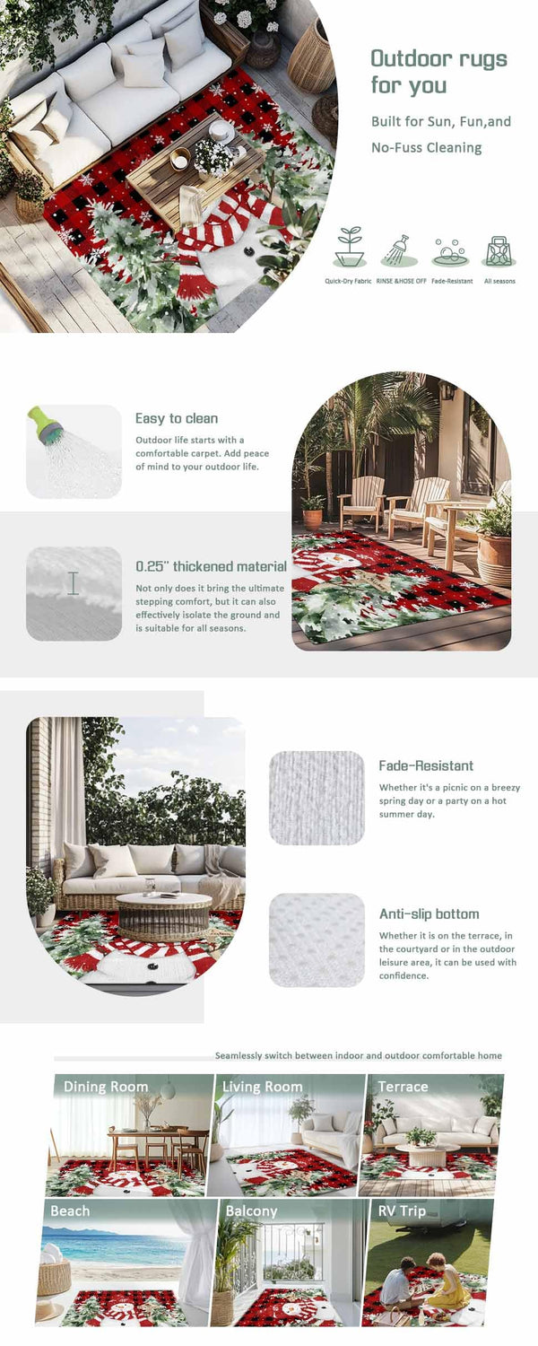 • Simple Maintenance: This waterproof outdoor rug for patios is easy to maintain—shake off dust, vacuum, rinse with a hose, or machine wash on gentle cycle. Quick-drying fabric keeps the outdoor patio rugs clean and ready, making them a smart choice for home or travel use