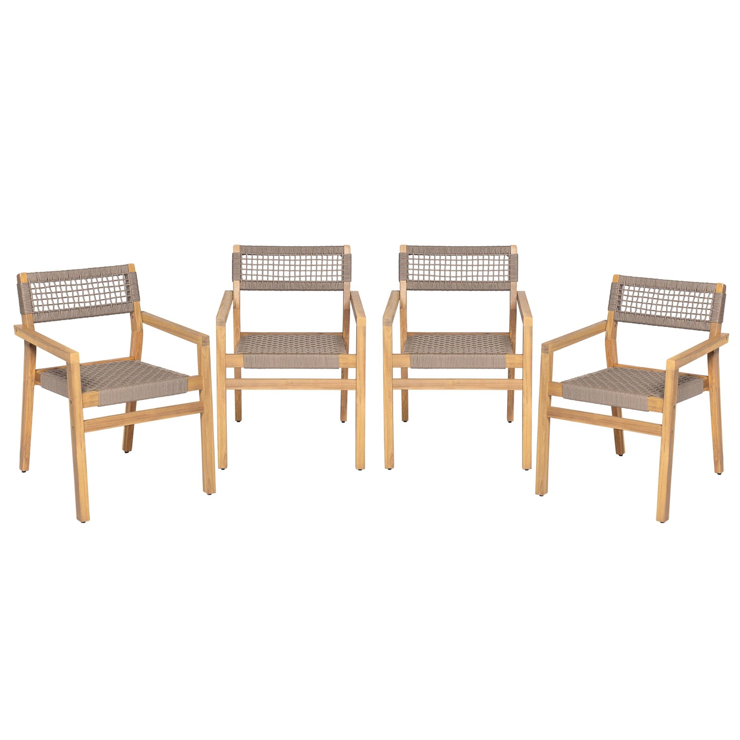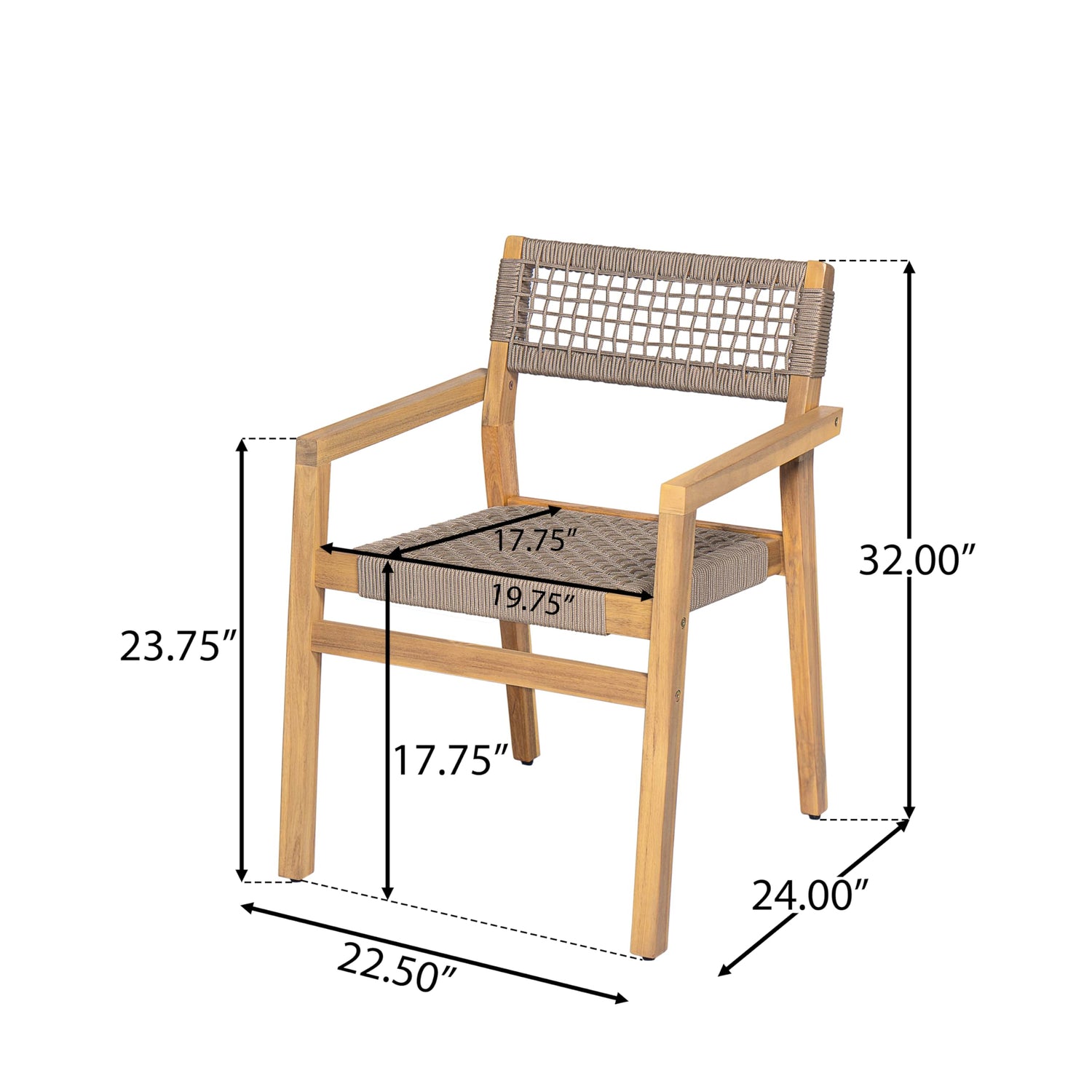 Details: Elevate your outdoor dining experience with our durable and stylish outdoor dining chair. Made from weather-resistant materials, this chair is built to withstand the elements and maintain its beauty over time. The sleek and modern design adds a touch of sophistication to any outdoor space, while the comfortable seat ensures a relaxing dining experience. Whether enjoying a meal on your patio, in your garden, or by the pool, this outdoor dining chair provides both comfort and style. Upgrade your outdoor entertaining area with our premium outdoor dining chair today. Material: Acacia Wood Rope Woven Dining Chairs Multiple Color Options Assembly Required Dining Chairs Set of 4