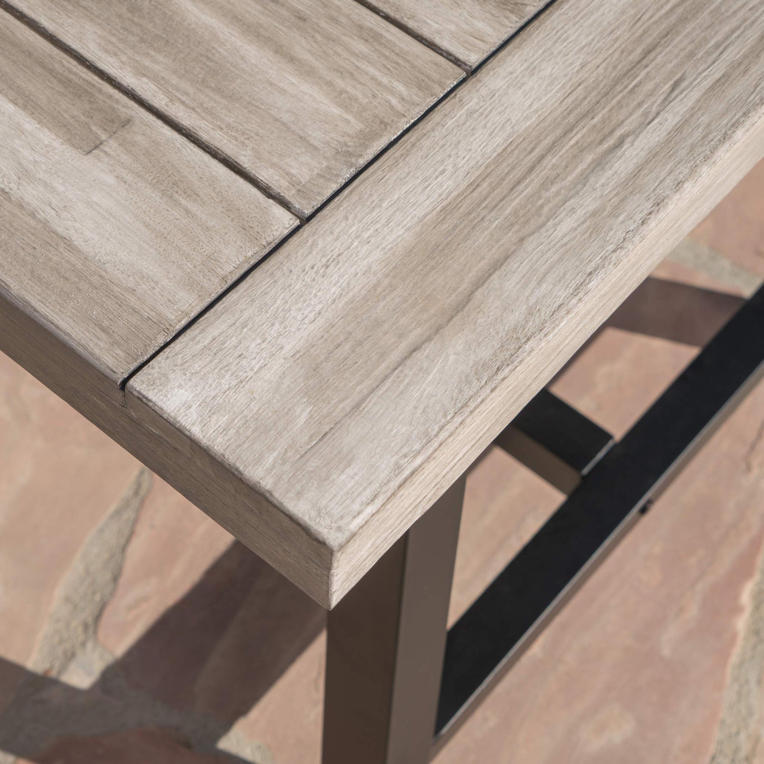 - Includes: one (1) table, one (1) Bench, and four (4) dining chairs. Table and Bench material: Acacia wood. Table and Bench Leg Material: iron. Chair Material: Polyethylene wicker