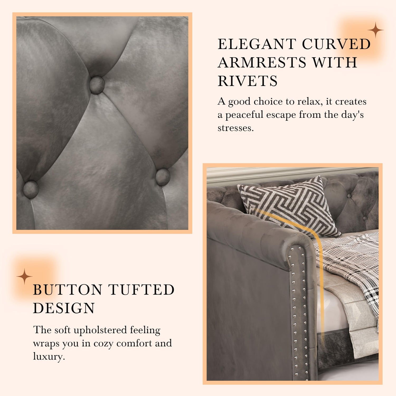 Details: Transform your living environment with our stunning Upholstered Velvet Daybed, a perfect blend of classic elegance and modern sophistication. Tailored for versatility, this daybed effortlessly enhances your home’s aesthetic while catering to your daily needs. The soft backrest and side armrests offer exceptional support and comfort, ensuring you relax in style. Its exquisite button-tufted design not only adds a touch of luxury but makes it a standout piece in any room. Material: Velvet Button-tufted Design Multiple Color Options Assembly Required Trundle Design