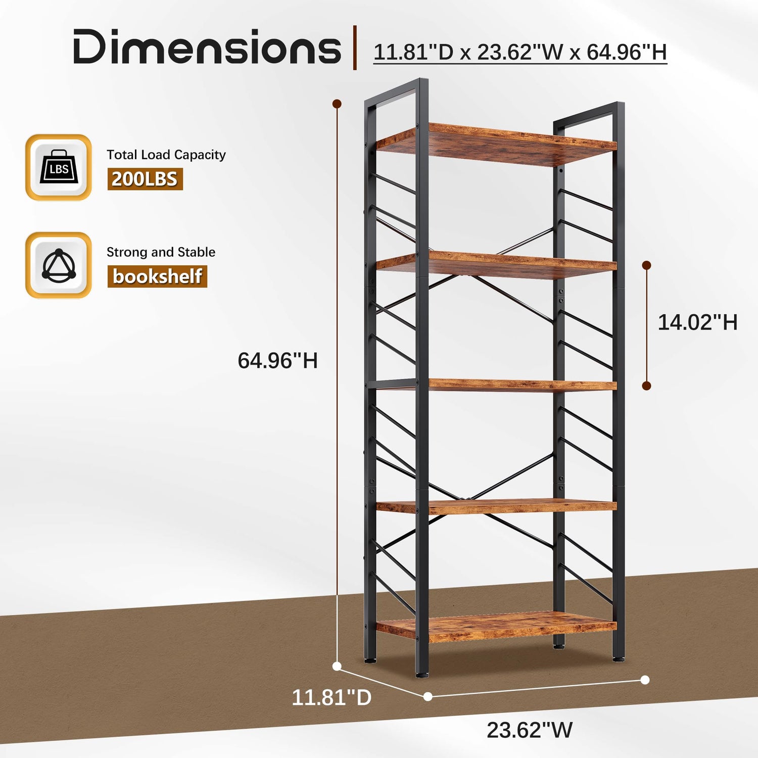 - 【Heavy-Duty Construction】: Crafted from premium metal frame and particle board, this compact11.81"D x 23.62"W x 64.96"H book shelf delivers robust performance. Each wooden board securely holds up to 40 lbs, with the entire unit supporting a total weight of 200 lbs. The sturdy metal bookshelf ensures remarkable stability, offering reliable storage with minimal floor space.
