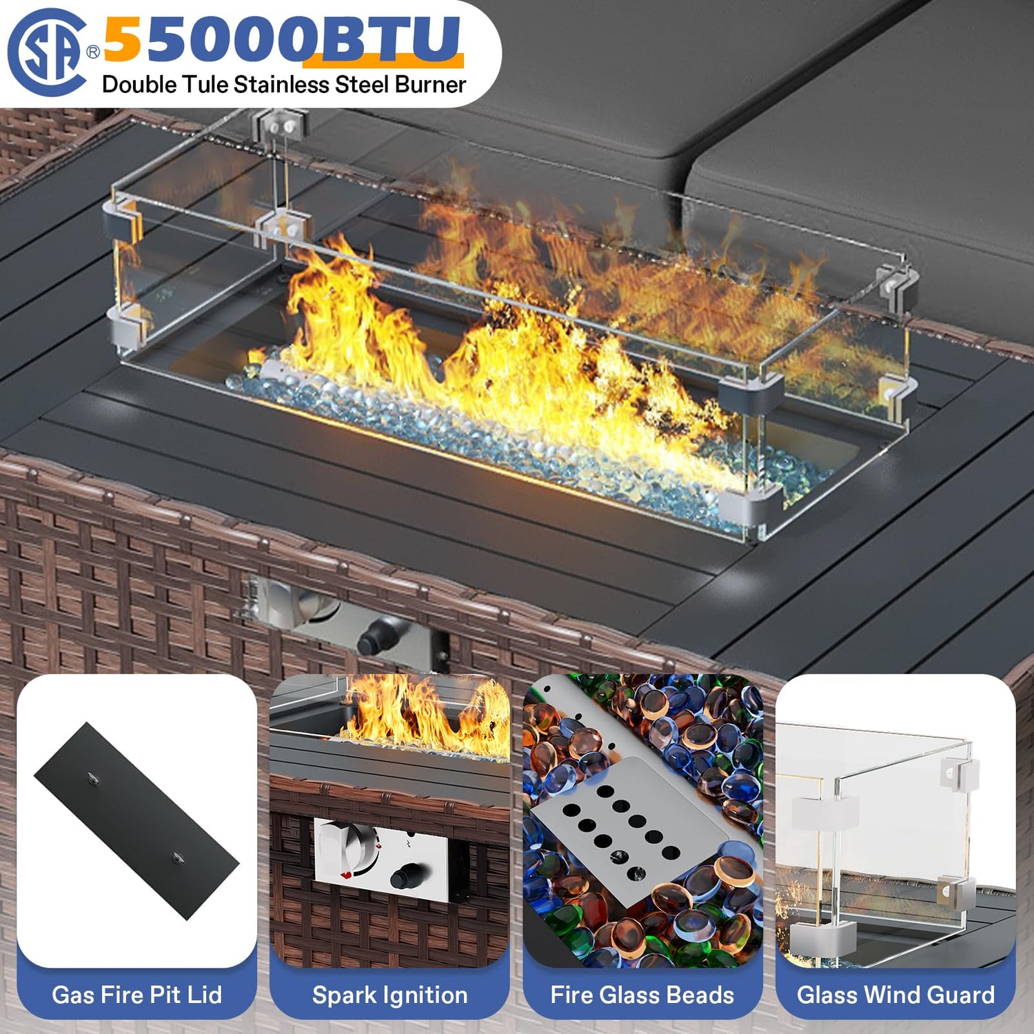 - 【POWERFUL HEAT OUTPUT】: The 55000 BTU outdoor firepit table with CSA certification.Upgraded dual-tube burner to provide more stable and cleaner combustion. Just turn it on or off with the knob to get warmth.