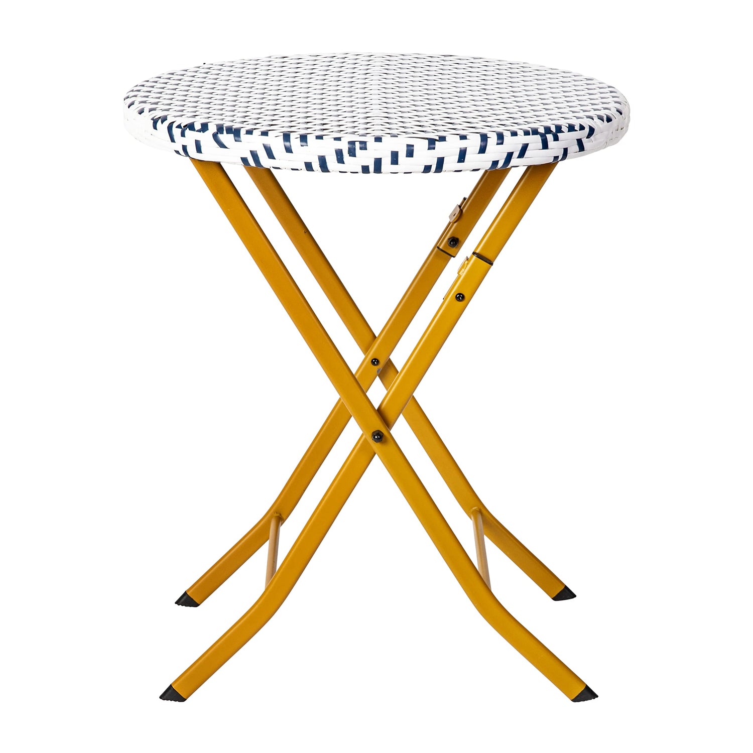 EMMA + OLIVER Ciel Three Piece Folding Bistro Set - Navy and White PE Rattan - Natural Finish Metal Frames - Indoor/Outdoor Use