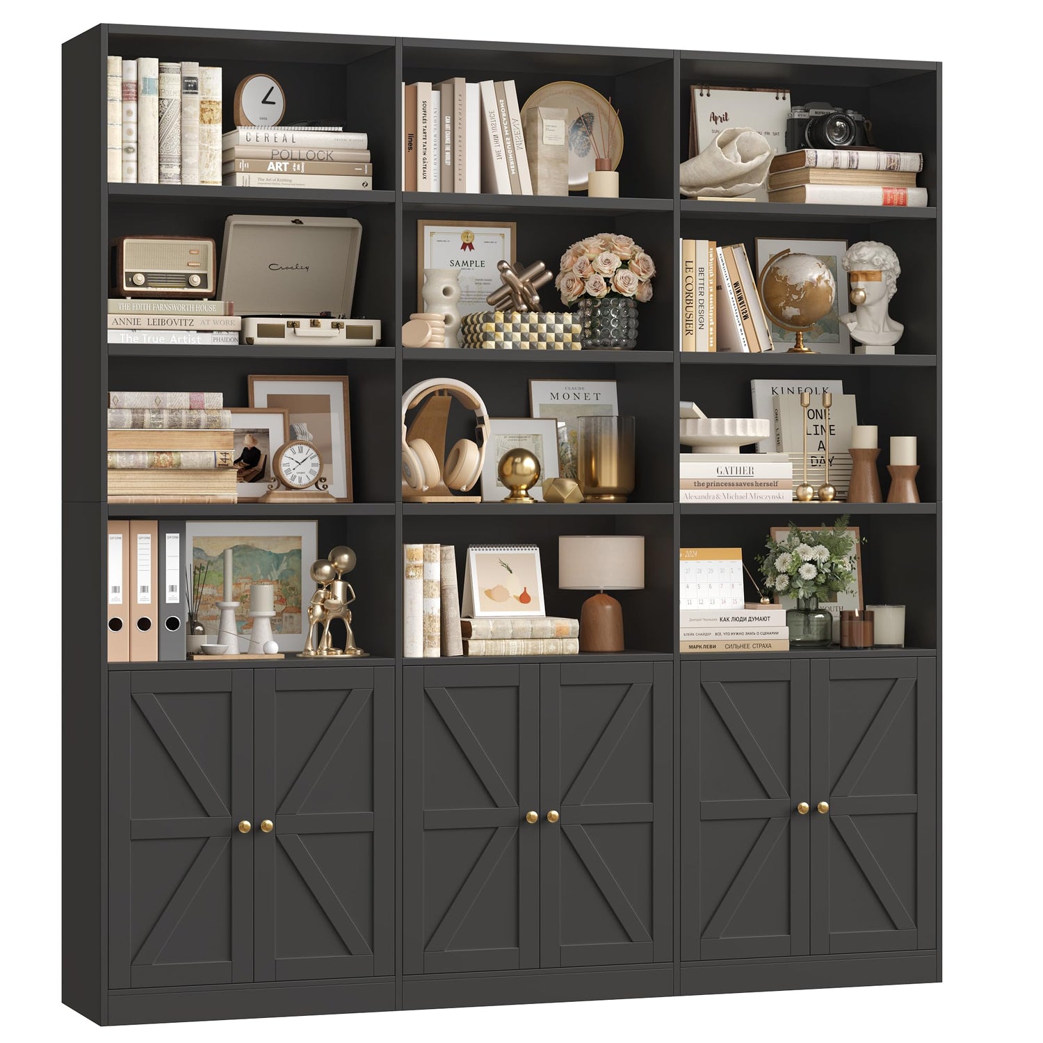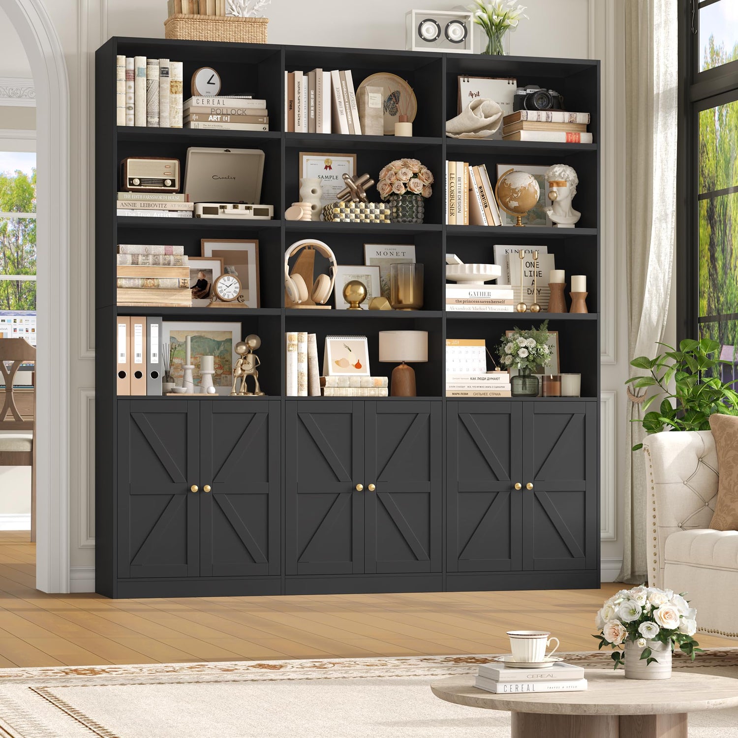 - Triple Wide Bookshelf & 6 Tiers: With 18 individual shelves and 6 enclosing doors, this tall bookshelf cleverly combines open and closed storage. It easily accommodates your books, photo albums, artifacts, decorative items, and more. The generous capacity allows you to create your library.