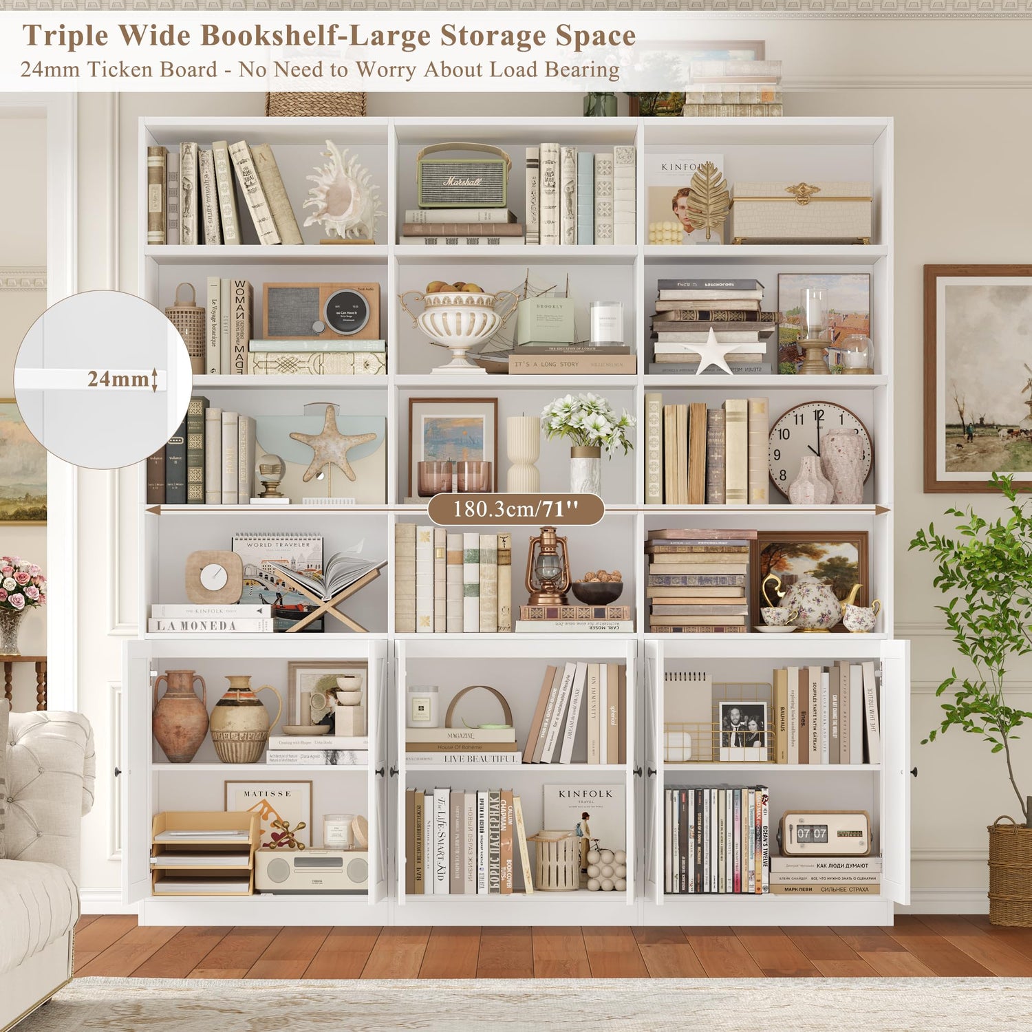 - Triple Wide Bookshelf & 6 Tiers: With 18 individual shelves and 6 enclosing doors, this tall bookshelf cleverly combines open and closed storage. It easily accommodates your books, photo albums, artifacts, decorative items, and more. The generous capacity allows you to create your library.