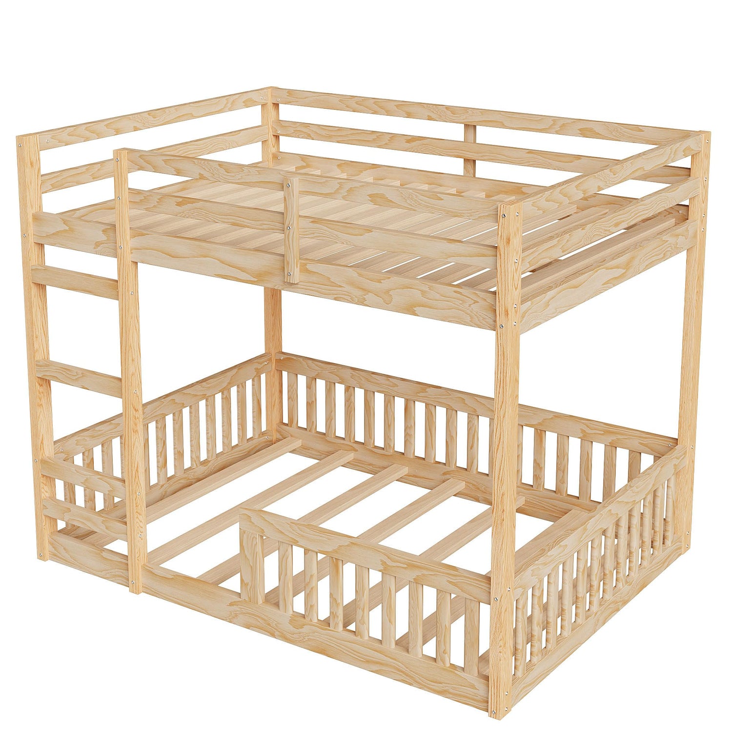 Full Over Full Bunk Bed with Ladders Wood Bunk Beds with Full-Length Guardrails Floor Bunk Bed Frame for Kids, Boys, Girls, No Spring Box Needed, Natural