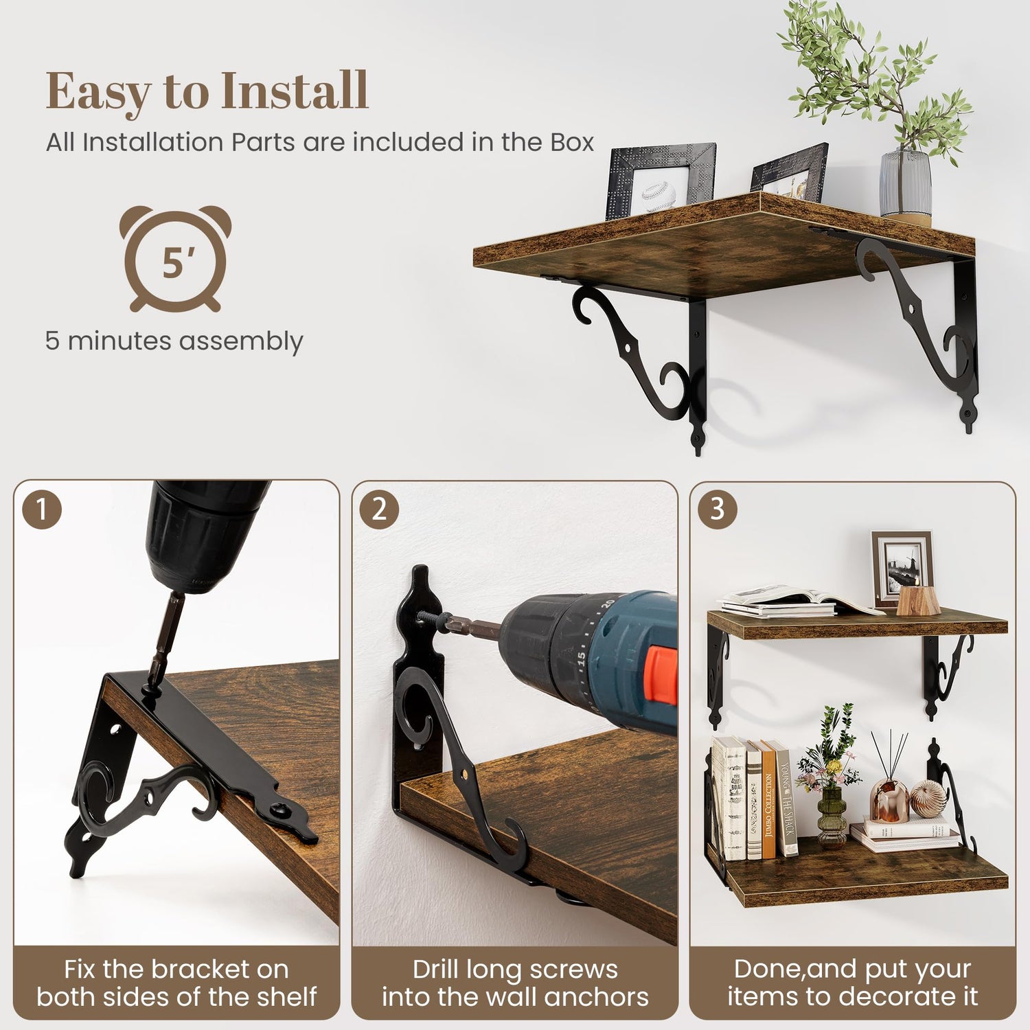 - RUSTIC FLOATING SHELF: Enhance your home decor with these rustic floating shelves. The sleek wood-grain surface and visible triangular brackets offer a charming rustic touch, adding warmth and style to both modern and traditional interiors. Transforming underutilized walls into functional, eye-catching displays.