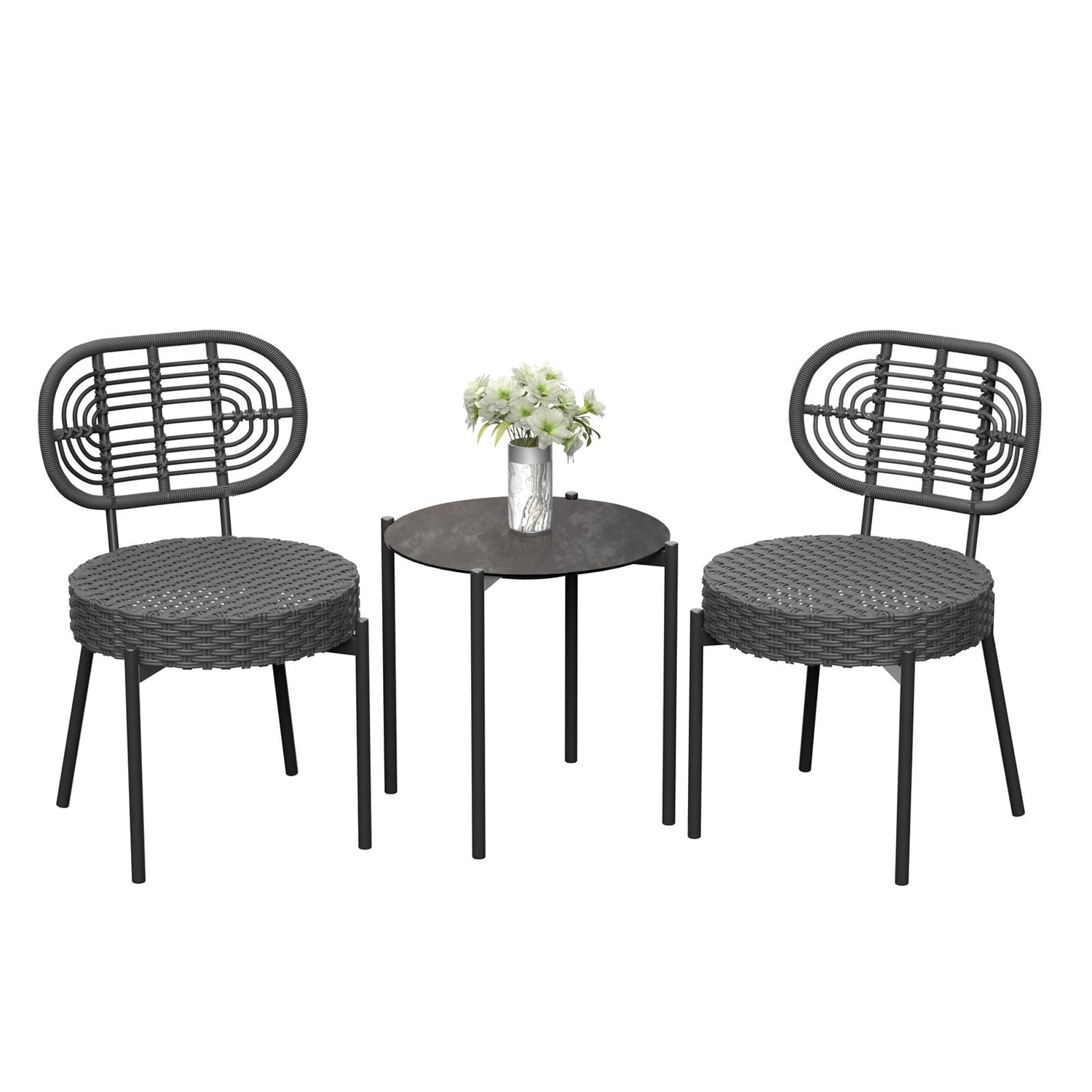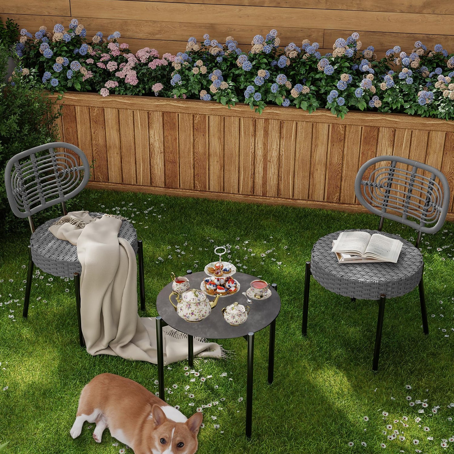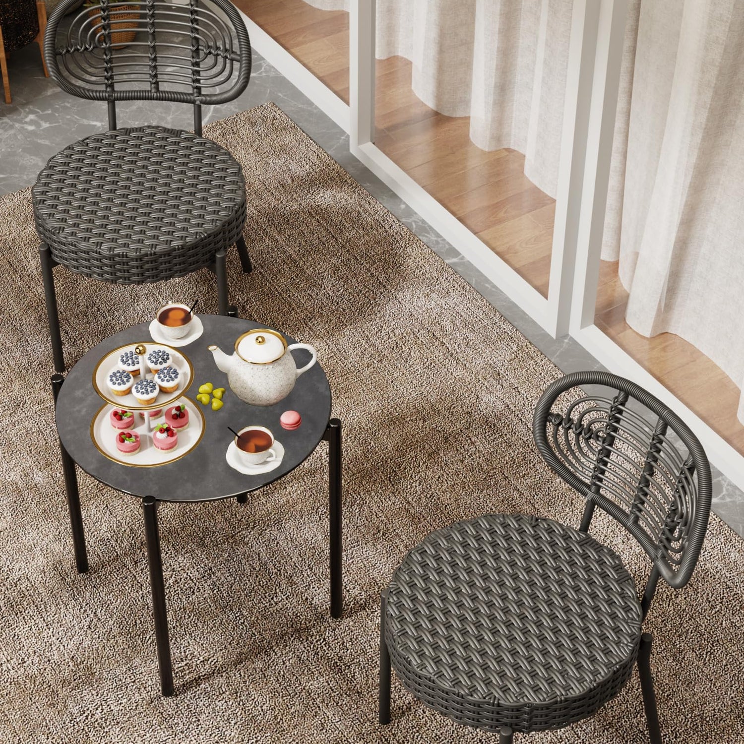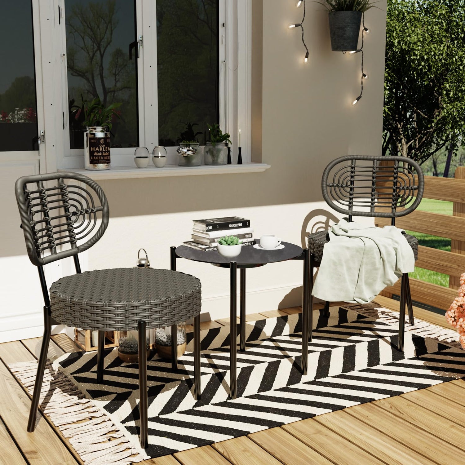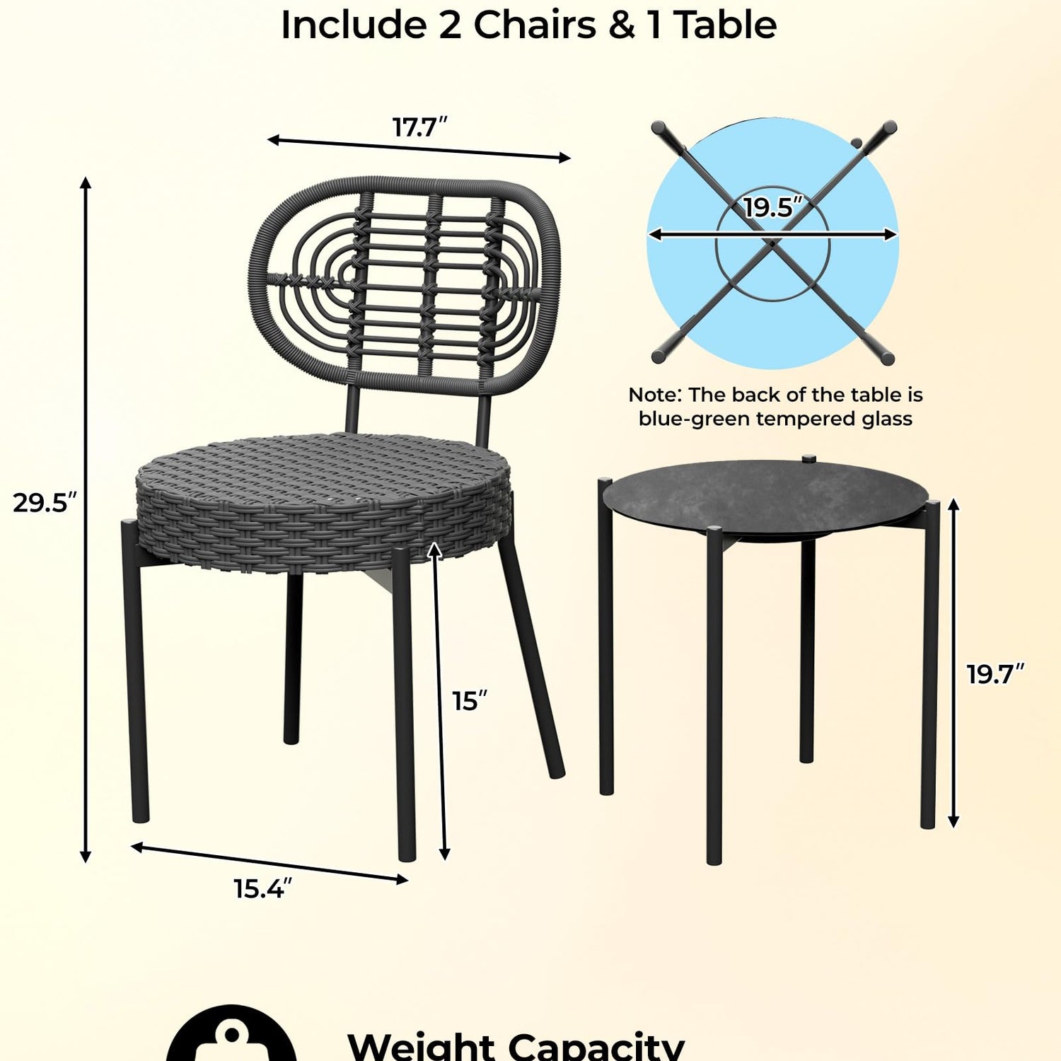 GarveeLife 3 Piece Wicker Patio Bistro Furniture Set, Outdoor Dining Chairs, Includes 2 Rattan Chairs and Tempered Glass Table, for Garden, Backyard, Balcony, Apartment, Black & Grey