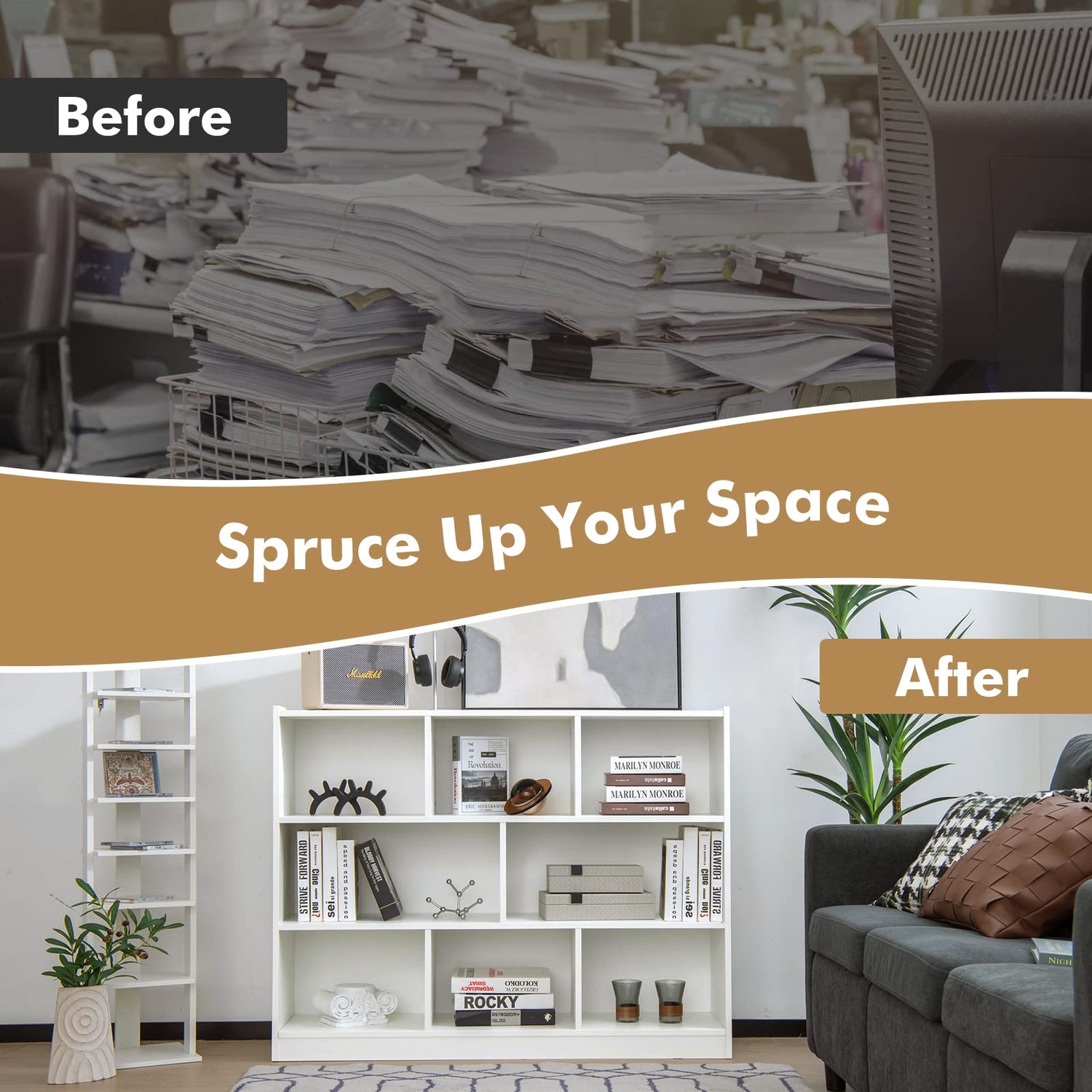 Made from thick man-made board and MDF with non-slip feet on the bottom, this cabinet is strong and durable throughout. 3 shelf bookcase is designed with 8 open shelf compartments for ample and diverse storage space, providing plenty of sorted storage space for your books, CDs, magazines and collectibles to keep your room organized, perfect for use in the living room, kitchen or bedroom as a display cabinet, bookcase, storage cabinets, toy cabinets, etc.