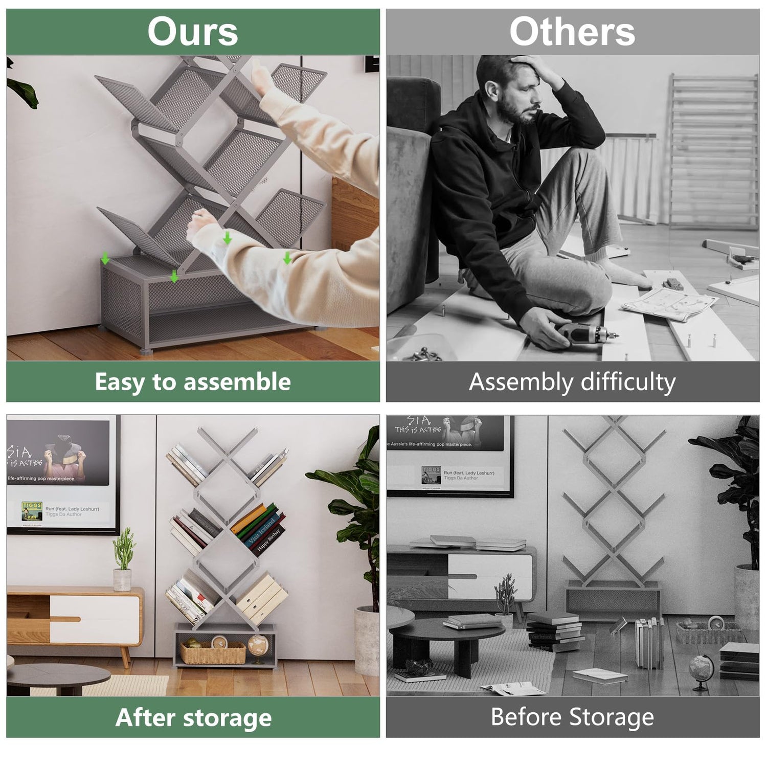 - Modern Design : It adopts a unique tree structure, the multifunctional partition design of the book case is perfect for displaying your books, CDs, magazines, video games, manga, decorations, novels, speakers and more. This storage rack is applied to any style of home decor.