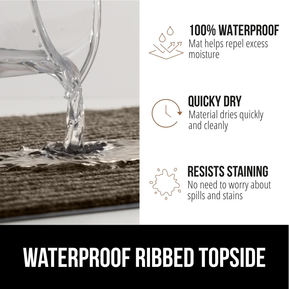 • WATERPROOF RIBBED TOPSIDE: ultra absorbent and 100% waterproof, the mat's surface helps to capture excess water and moisture; plus, premium fabric dries quickly and resists staining and fading for long lasting use