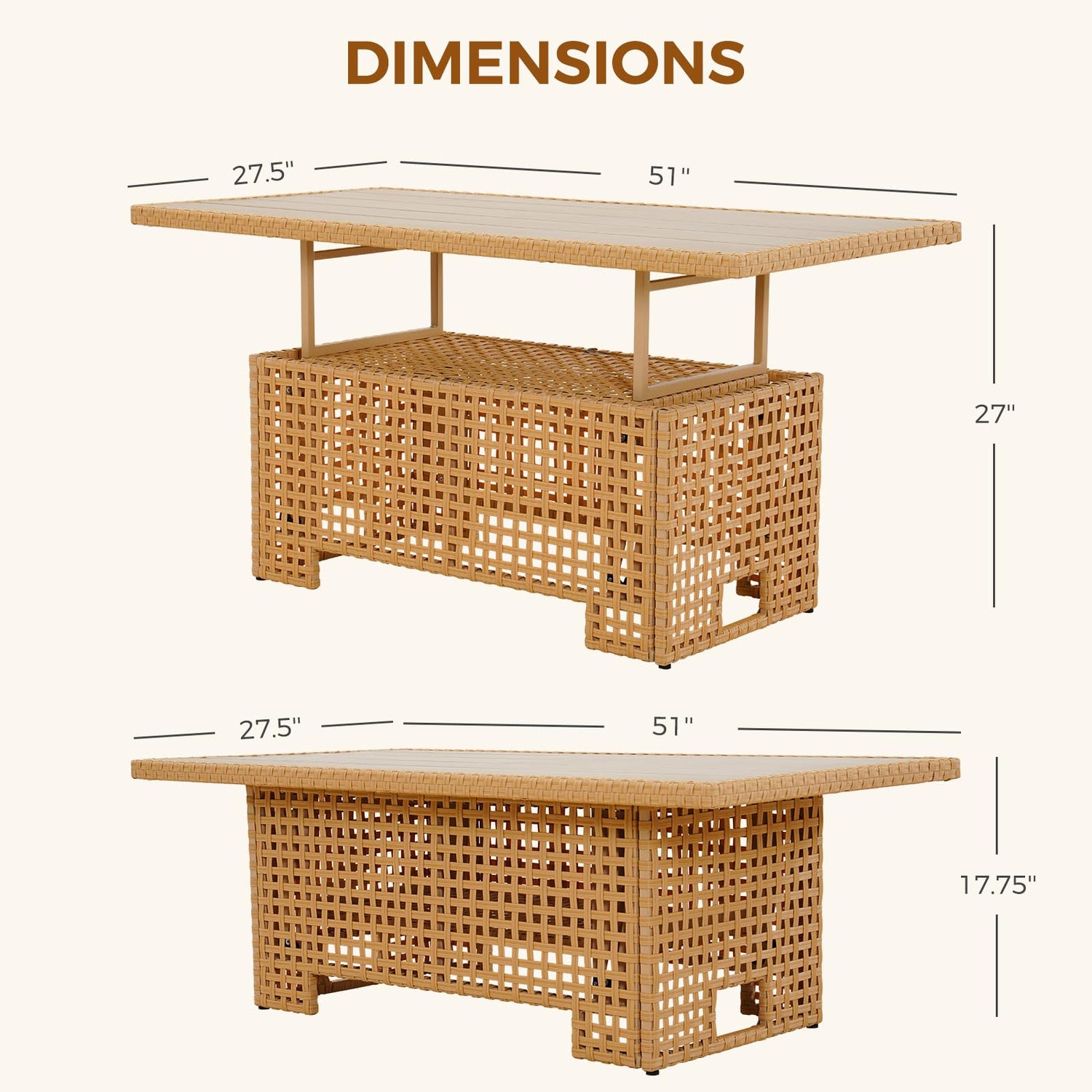 • DUAL-PURPOSE & STORAGE: Featuring a liftable top design, this patio coffee table effortlessly converts into a dining table. The integrated storage shelf, accessible when the table is lifted, is ideal for keeping snacks, magazines, blankets, pillows, furniture covers, and more organized