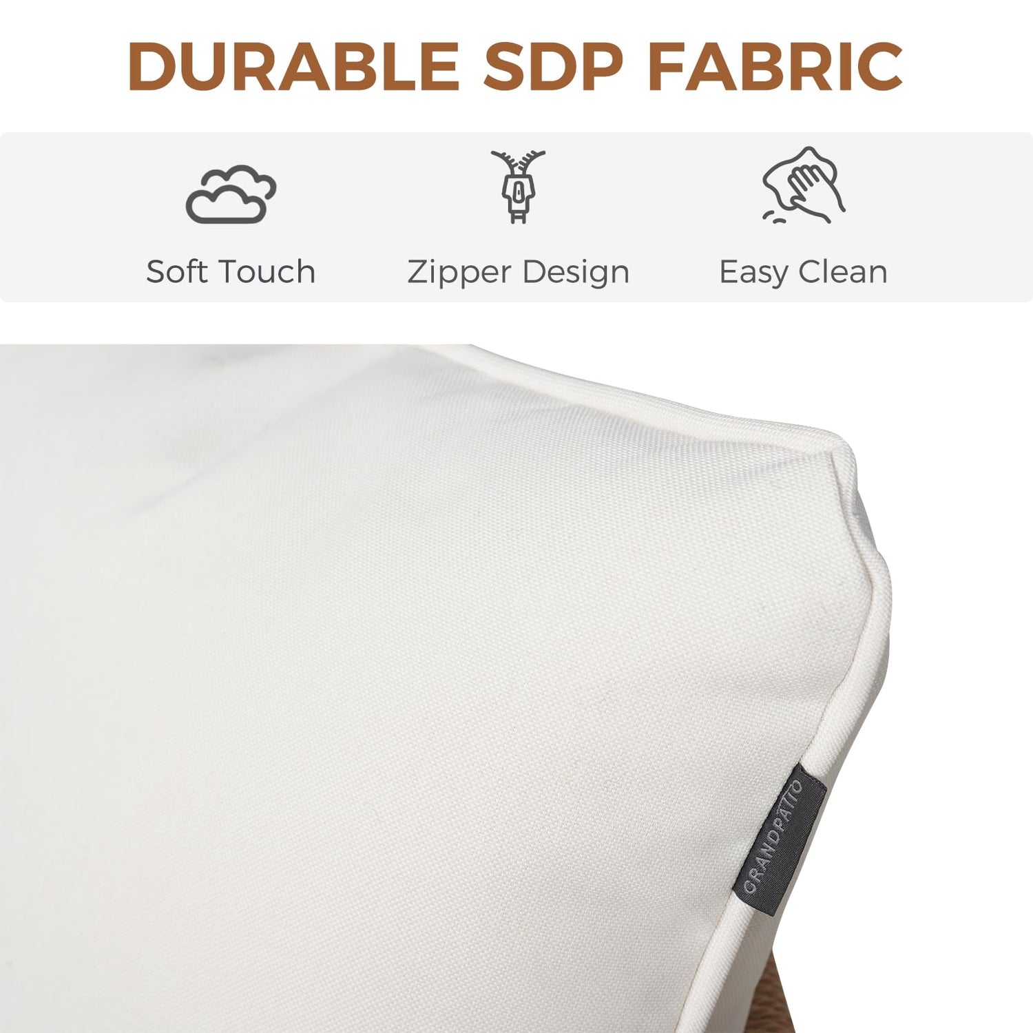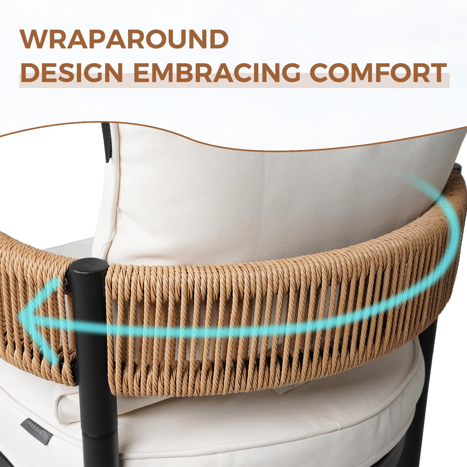 - THICKENED CUSHION: 230 grams of light-beige SDP fabric. Soft and skin-friendly, fade-resistant, durable and adaptable to many kinds of outdoor weather. The dining chairs with 3.15-inch cushions provide an upgraded level of comfort.